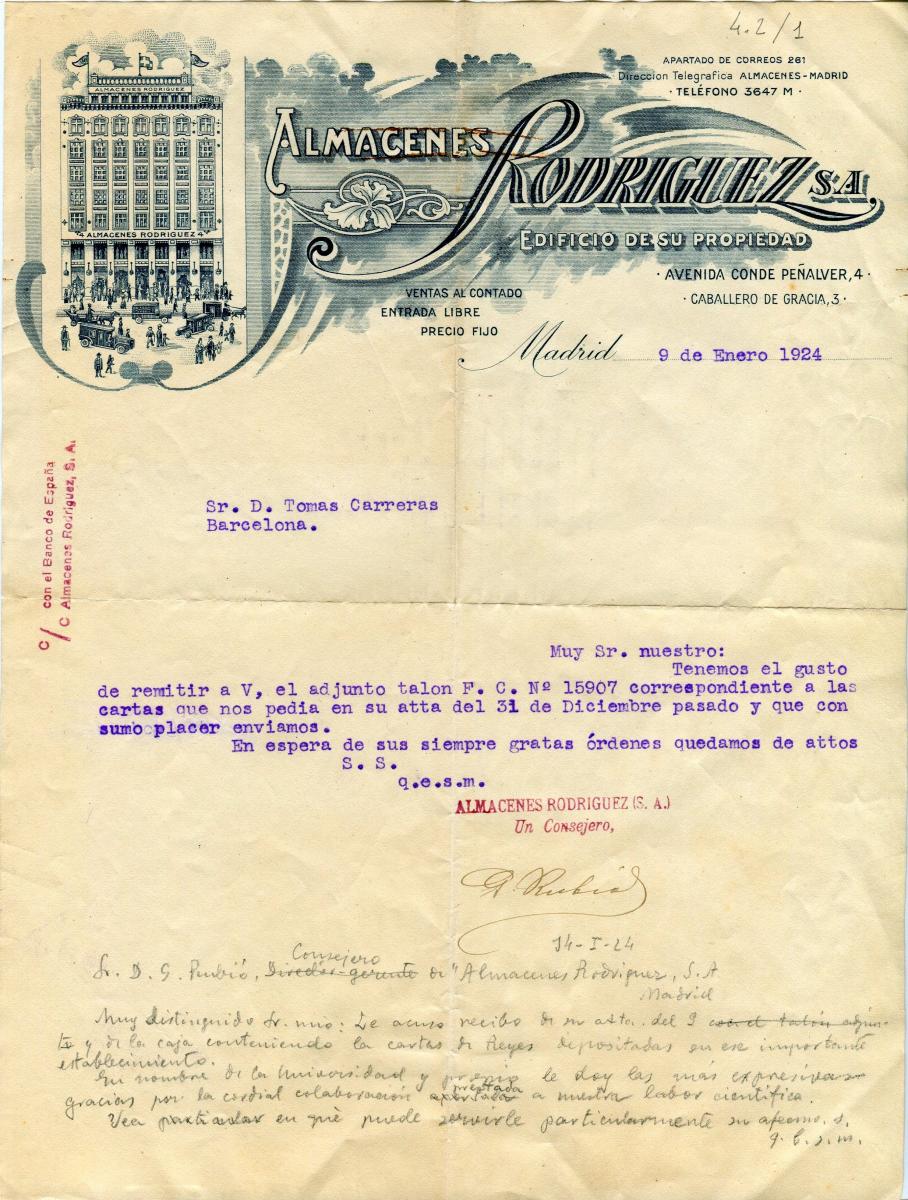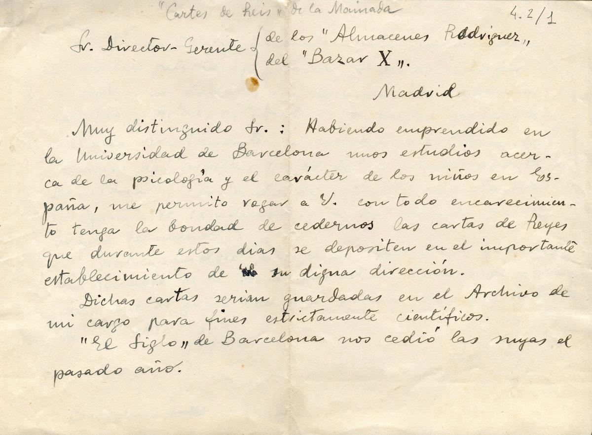 Amb la selecció que exposem, n’hi ha dues que contextualitzen les cartes dels infants. La primera és l’esborrany manuscrit de Tomàs Carreras i Artau, datada a Barcelona el 2 de gener de 1923, adreçada als directors o gerents dels magatzems per demanar-los que li siguin remeses les cartes entregades pels nens i nenes. Carreras hi argumenta l’objectiu de la seva sol·licitud dient que ”...habiendo emprendido en la Universidad de Barcelona unos estudios acerca de la psicología y del carácter de los niños en España …” li seran de gran utilitat per conèixer els desitjos infantils. La segona, datada el 9 de febrer de 1924, és la resposta del Consejero dels Almacenes Rodríguez de Madrid, sr. G.Rubió, en la que li comunica que ja ha estat tramès el plec de les cartes als Reis. La mateixa carta porta l’esborrany de la resposta de Carreras als Almacenes Rodríguez agraint, en nom de la Universitat de Barcelona, la seva tramesa.