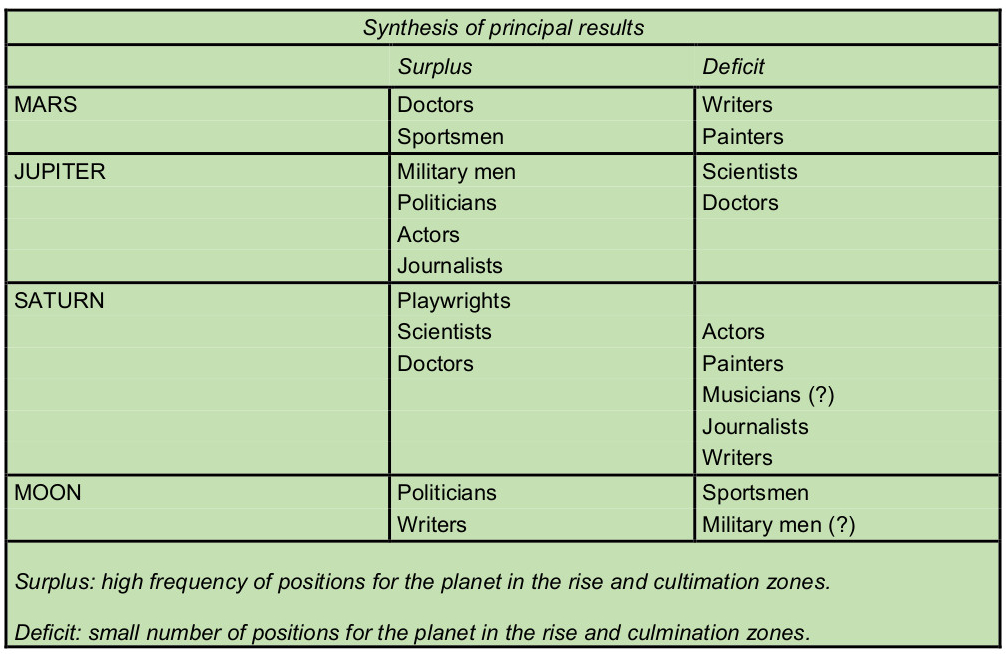 | Taula resum dels principals resultats de les investigacions del matrimoni Gauquelin, elaborada per Eysenck. | ![]() |