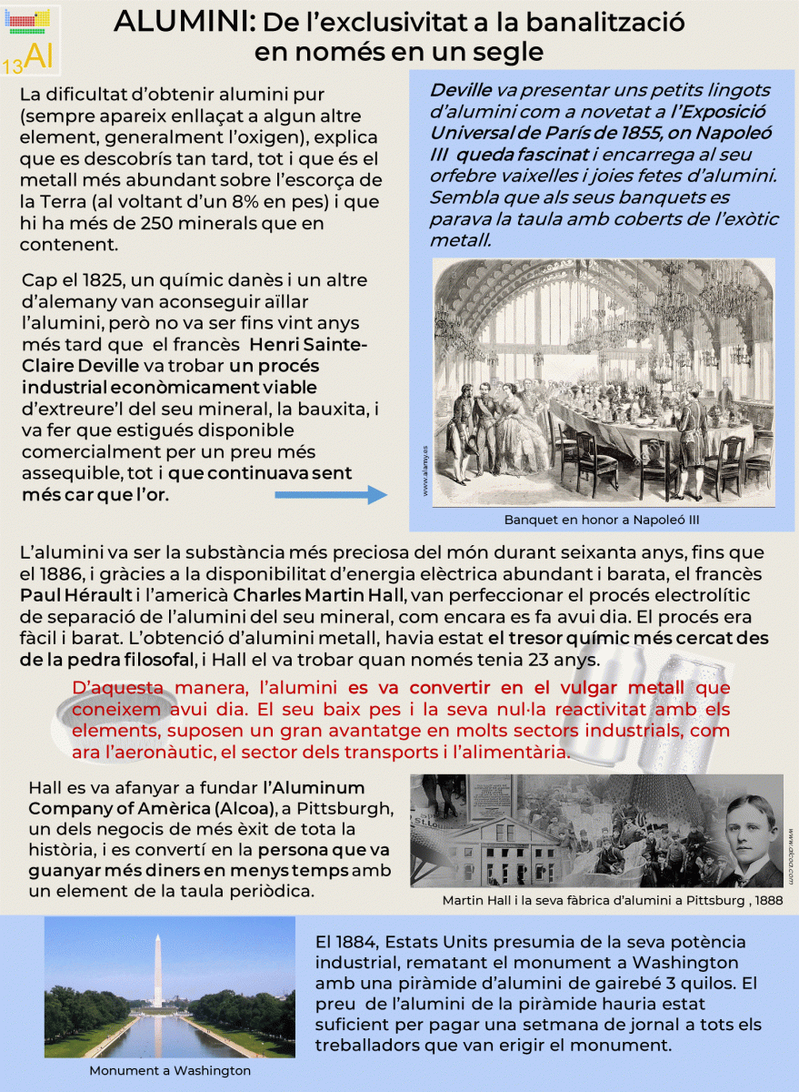 Universal de París de 1855, on Napoleó III  queda fascinat i encarrega al seu orfebre vaixelles i joies fetes d’alumini. Sembla que als seus banquets es parava la taula amb coberts de l’exòtic metall.
