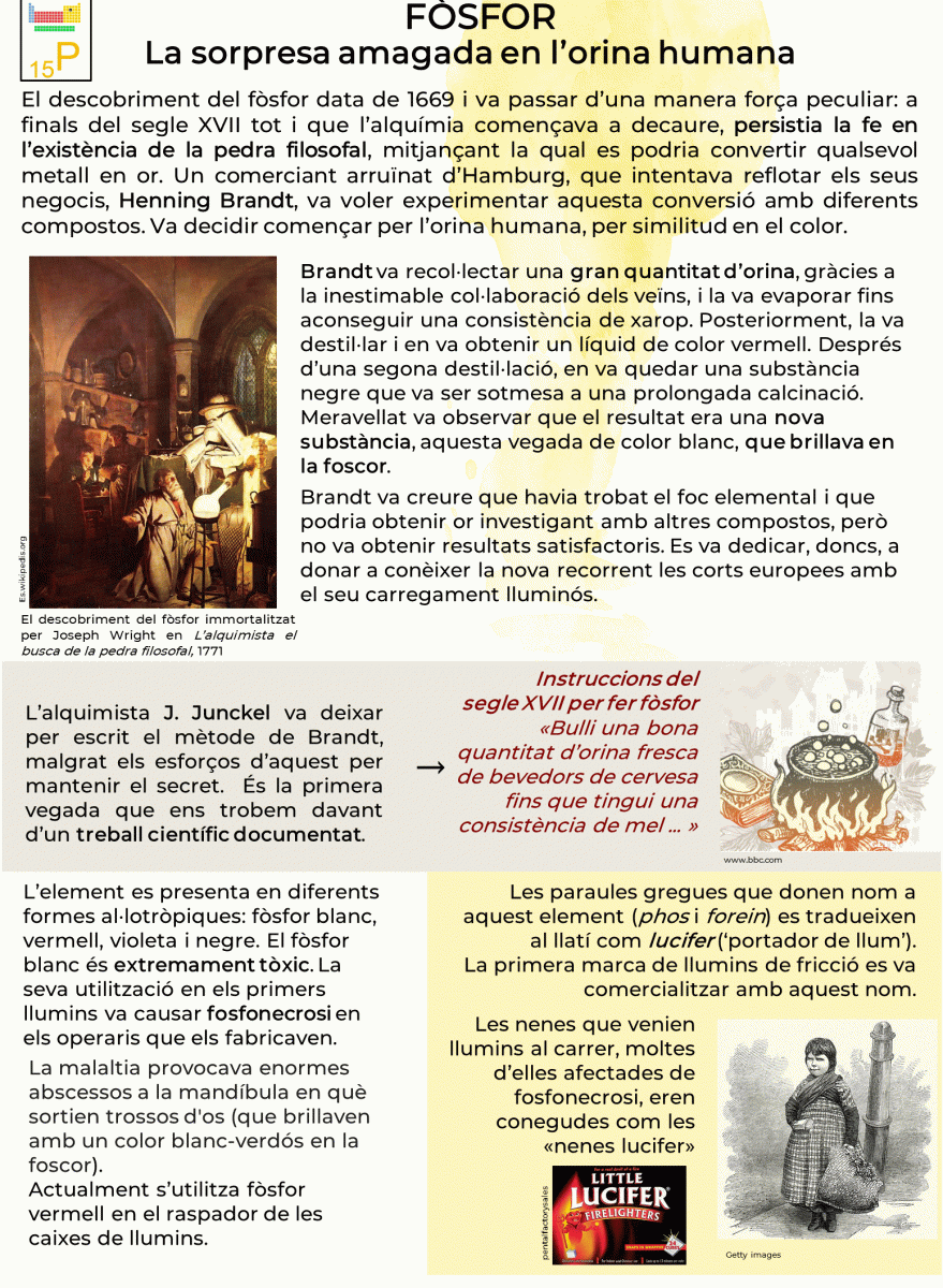El descobriment del fòsfor data de 1669 i va passar d’una manera força peculiar: a finals del segle XVII tot i que l’alquímia començava a decaure, persistia la fe en l’existència de la pedra filosofal, mitjançant la qual es podria convertir qualsevol metall en or. Un comerciant arruïnat d’Hamburg, que intentava reflotar els seus negocis, Henning Brandt, va voler experimentar aquesta conversió amb diferents compostos. Va decidir començar per l’orina humana, per similitud en el color.