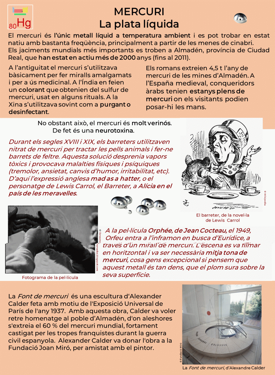 A la pel·lícula Orphée, de Jean Cocteau, el 1949, Orfeu entra a l’inframon en busca d’Eurídice, a través d’un mirall de mercuri. L’escena es va filmar en horitzontal i va ser necessària mitja tona de mercuri, cosa gens excepcional si pensem que aquest metall és tan dens, que el plom sura sobre la seva superfície.