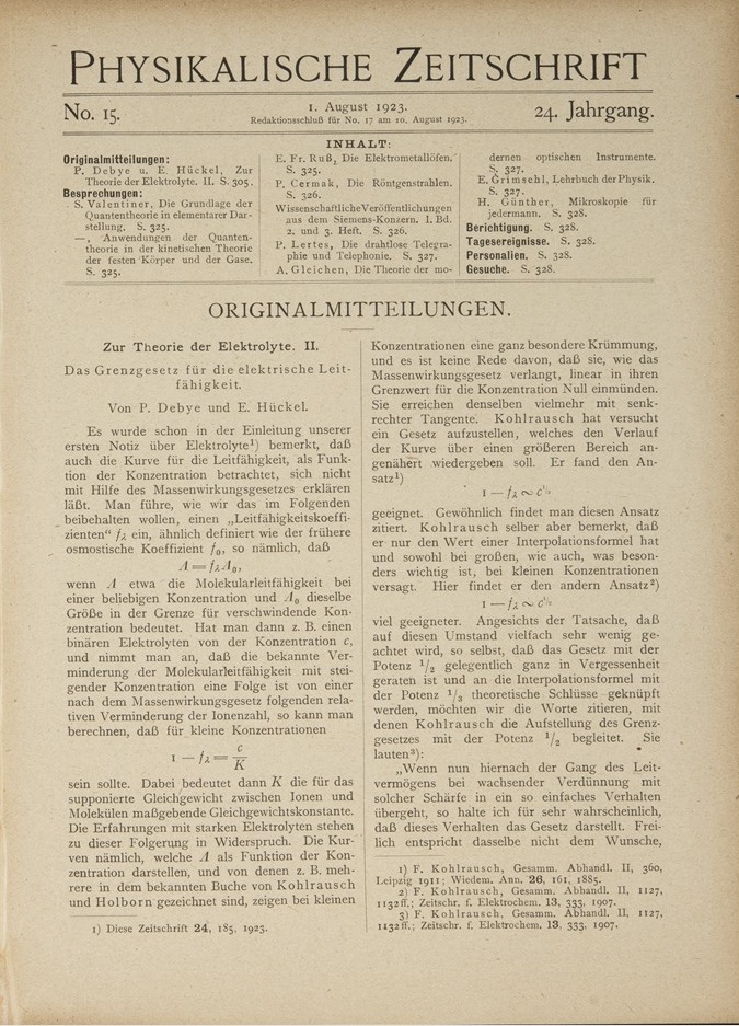 Primer llibre complet dedicat a les dissolucions d'electròlits per un deixeble i col·laborador de Debye, Hans Falkenhagen, que també va fer contribucions molt importants tan en l'aspecte experimental com en el teòric.