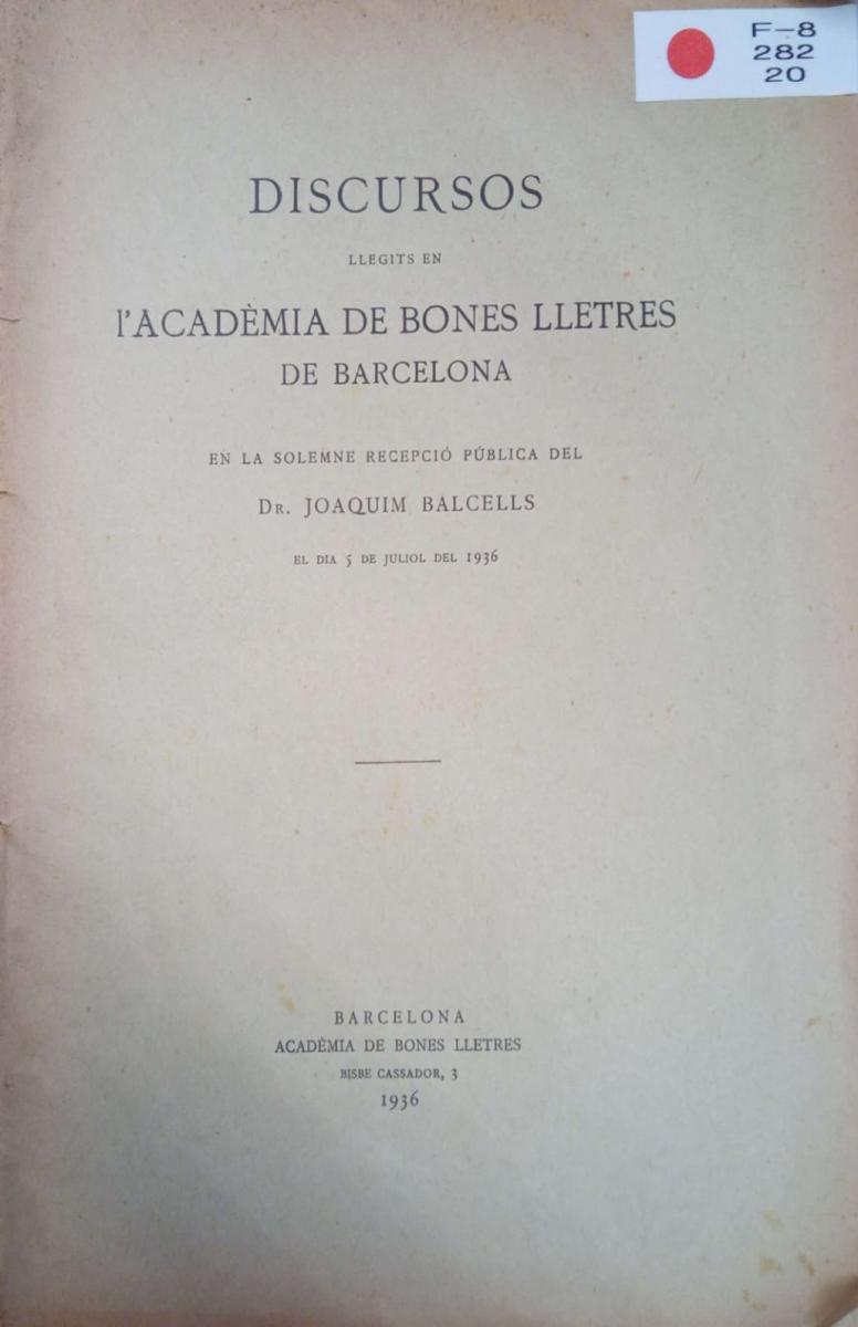 (74) Joaquim Balcells, “Cató el Vell i una concepció democràtica de la Història”, Discursos llegits en l’Acadèmia de Bones Lletres de Barcelona en la solemne recepció pública del Dr. Joaquim Balcells el dia 5 de juliol del 1936, Barcelona, Acadèmia de Bones Lletres.