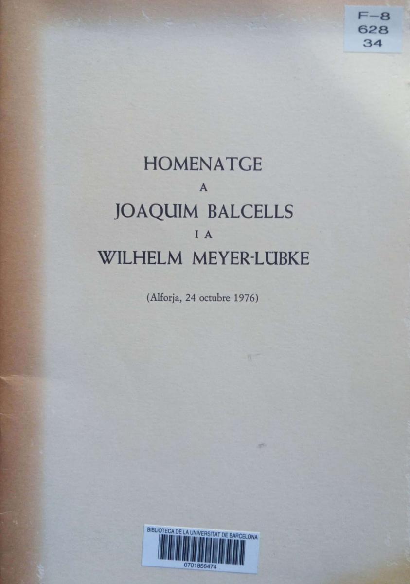 (75) Homenatge a Joaquim Balcells i a Wilhelm Meyer-Lübke. Discursos llegits a Alforja, el 24 d'octubre de 1976, en commemoració del quarantè aniversari de llur traspàs, Barcelona, s.n. 1982.