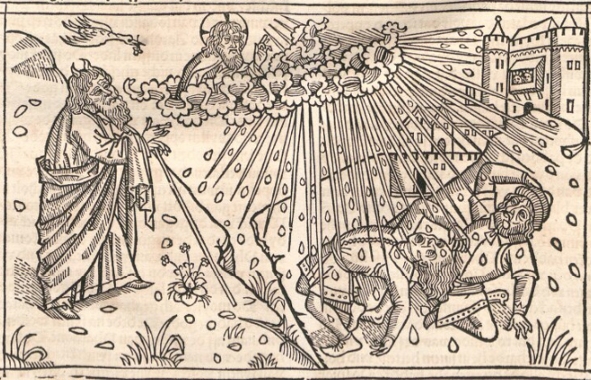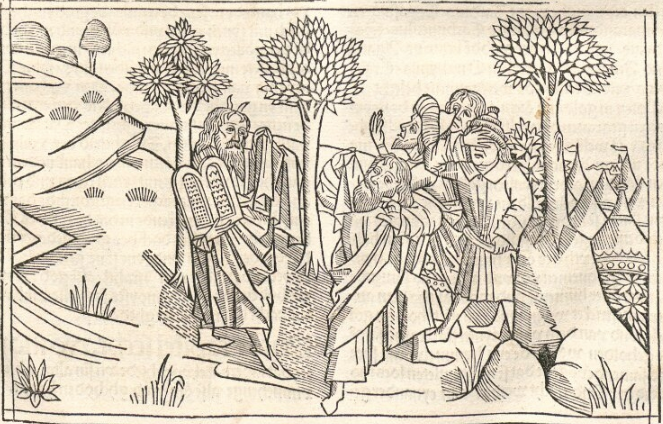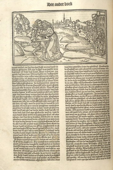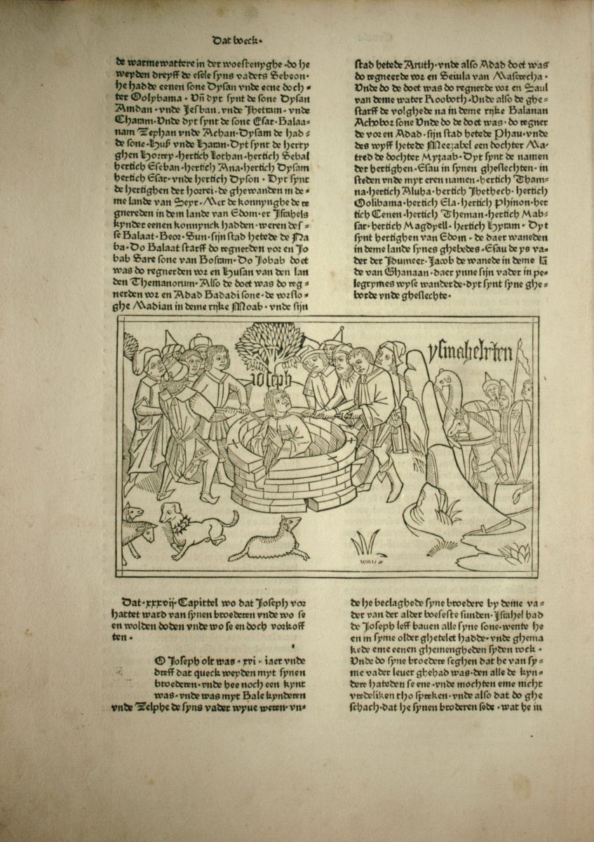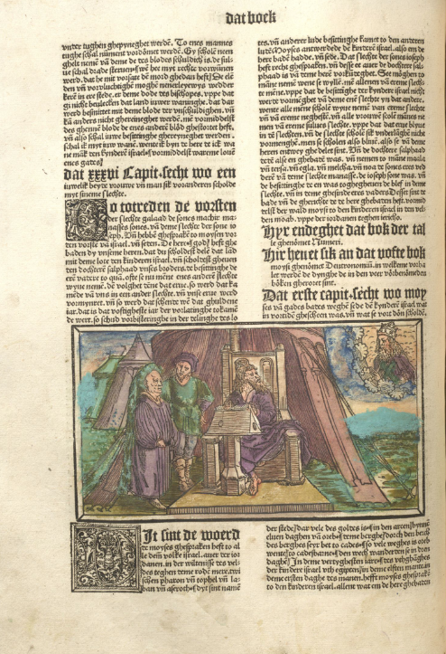 1478-79: Bíblia de Colònia (Kölner Bibel) dels impressors Heinrich Quentell i Bartholomäeus von Unckel. És una de les quatre Bíblies escrites en el dialecte baixalemany (niederdeutschen). Es van produir dues edicions d’una Bíblia profusament il·lustrada, amb 123 xilografies o il·lustracions de format apaïsat, tot ocupant l’espai de les dues columnes del text (vegeu les imatges més avall)). El paper protagonista que aquesta Bíblia va conferir a les imatges serà recollit i seguit en el seu moment per Luther, qui tenia ben clar des del principi que les il·lustracions havien de combinar–se amb el text bíblic per potenciar l’impacte visual del llibre sagrat. Quentell en va fer una edició en dialecte baixrenà o neerlandès. La Bíblia de Colònia basa el seu text més en la Bíblia de Zainer que no pas en el llatí de la Vulgata. Les il·lustracions de Colònia van influir posteriorment en artistes com Albert Dürer i Matthäus Merian. | |