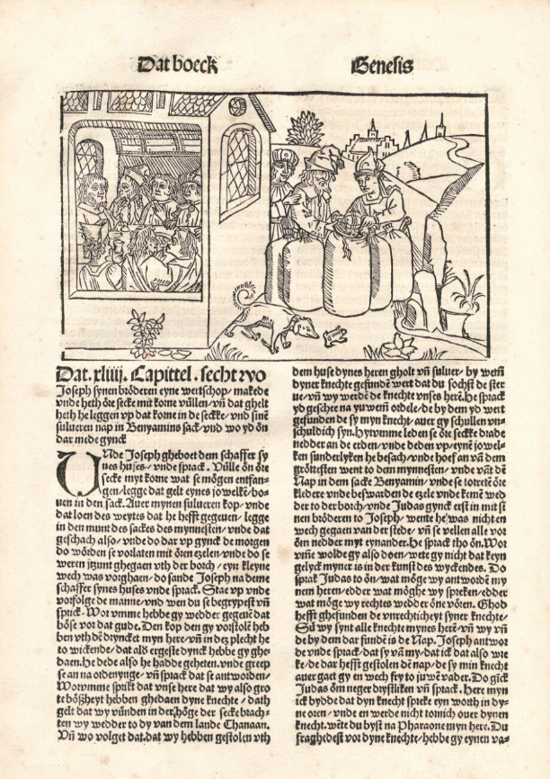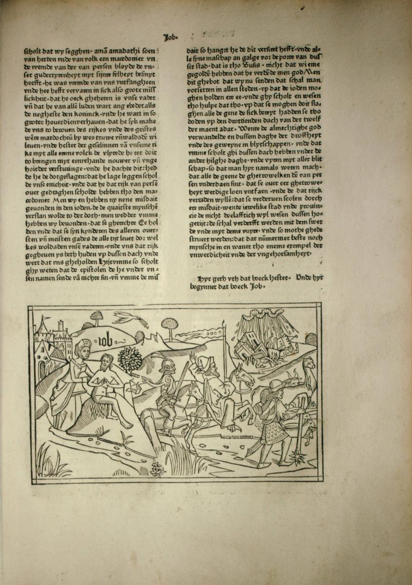 | 1494: Bíblia de Lübeck (Lübecker Bibel) de l'impressor Steffen Arndes (ca. 1450–1519). Una altra Bíblia en dialecte baixalemany (niederdeutschen o, segons la denominació pròpia de l'època, niedersächsischem Dialekt) que inaugura un nou cicle de Bíblia il·lustrada, anant més enllà de la feina feta per la Bíblia de Colònia. Els cinc llibres de Moisès (Pentateuc) presenten unes il·lustracions bellíssimes, potser les millors que s’havien fet fins aquell moment. S’hi pot percebre la influència de l’escola pictòrica holandesa–flamenca. Tot i que el traductor segueix de prop la Vulgata i altres Bíblies alemanyes, hi ha passatges que la traducció podria qualificar-se de lliure o arbitrària. | |
