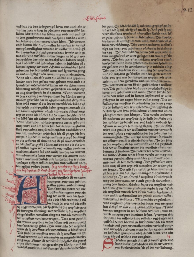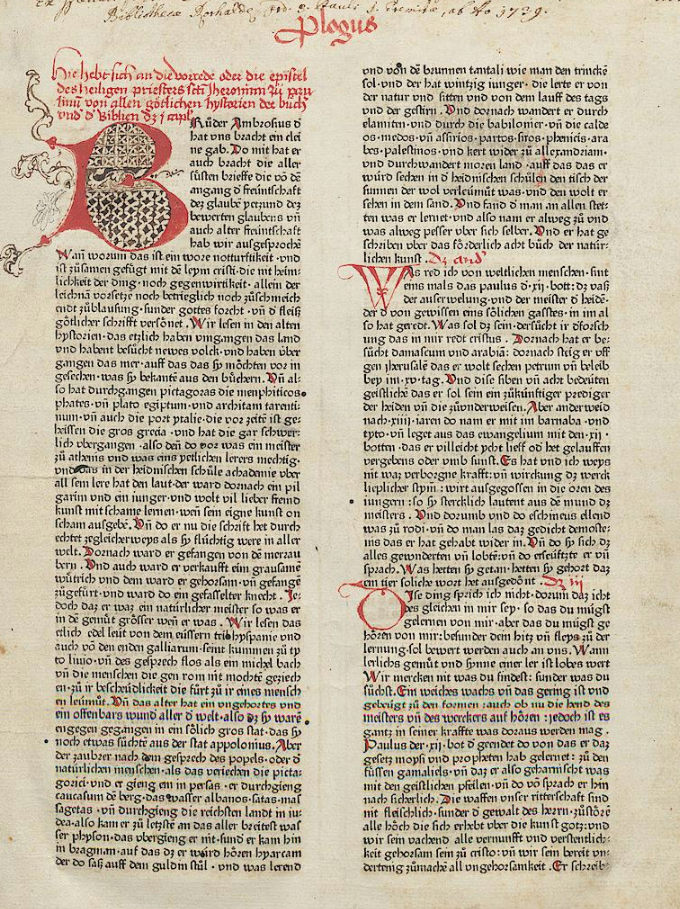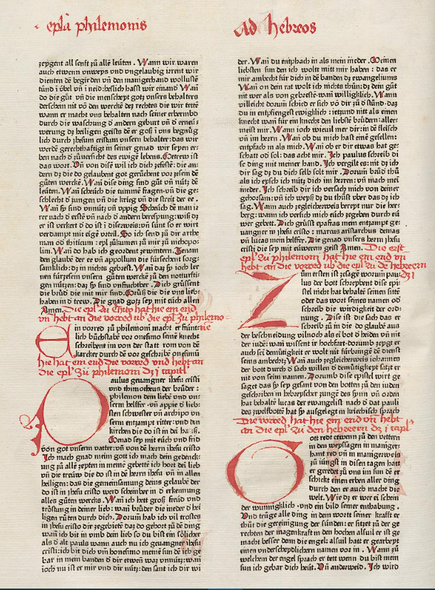 1470: Bíblia de l’impressor Heinrich Eggestein (Eggestein Bibel, Estrasburg). La Bíblia d'Eggestein (ca. 1415–1488), un impressor que va aprendre l'ofici al taller del mestre Gutenberg, és la 2a Bíblia impresa en llengua alemanya, el text de la qual es basa en la Bíblia feta per Mentelin quatre anys abans, encara que introdueix paraules més modernes que no pas el seu antecessor. La disposició del text també segueix l'exemple de Mentelin, tot presentant-lo en dues columnes, però amb 60 línies per columna. Es va publicar sense portada ni colofó, per la qual cosa la data d'edició és aproximada. Com l'anterior, no conté imatges (gravats), sinó guarniments i inicials fets a mà pels rubricadors. Totes les majúscules i els inicis de frase estan subratllats per una petita i fina línia vermella, que és el tret més característic d'aquesta edició. | |