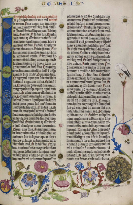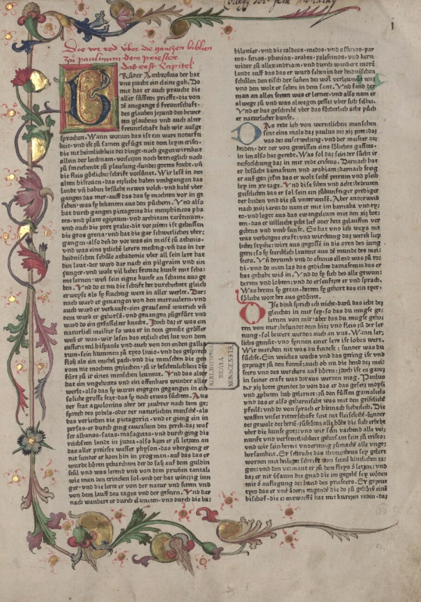 1466: Bíblia de l’impressor Johann Mentelin (Mentelin Bibel, Estrasburg) és la primera Bíblia impresa en alemany i, per tant, la més antiga. Mentelin (ca. 1410–1478), antic cal·lígraf i notari, va aprofitar la traducció que un autor anònim de l’àrea de Nuremberg havia fet cent anys abans. Es tracta d’una traducció molt deficient, que demostra, entre d’altres coses, els escassos coneixements que l’autor tenia del llatí de la Vulgata, que és el que va fer servir de llengua d’origen. El dialecte emprat en aquest cas és l’altalemany mitjà (mittelhochdeutsche Sprache) i se’n varen fer catorze edicions de 1466 a 1518, deu de les quals aparegueren entre 1475–1490. Mentelin, seguint el model de la Bíblia de Gutenberg, va presentar el text de cada pàgina a dues columnes, però va fer servir un tipus de lletra més petit, cosa que li va permetre encabir fins a 61 línies per columna i fer un volum de 812 pàgines en total. La de Mentelin no es pot considerar una Bíblia il·lustrada, perquè només conté inicials acolorides i circells florals, fets a mà pels rubricadors, com es mostra en aquestes dues imatges. | |