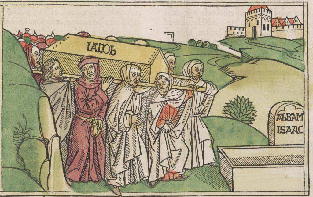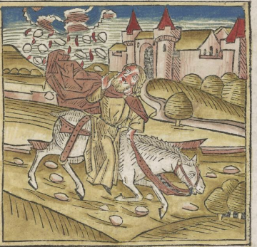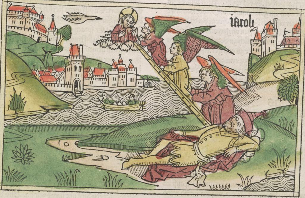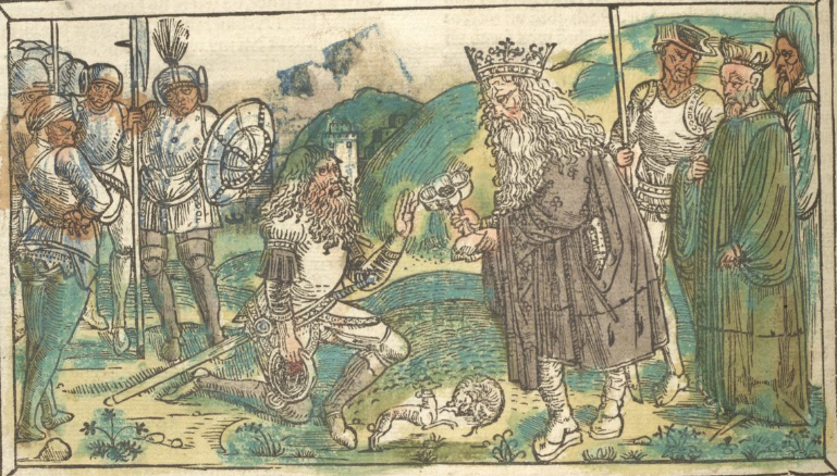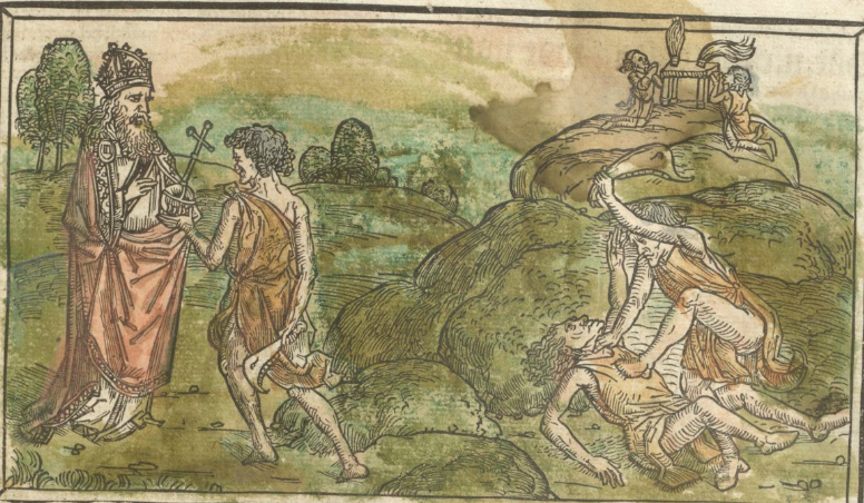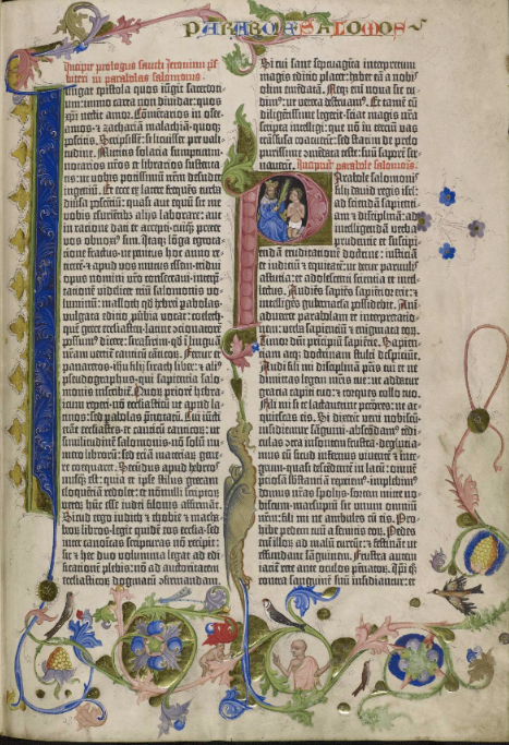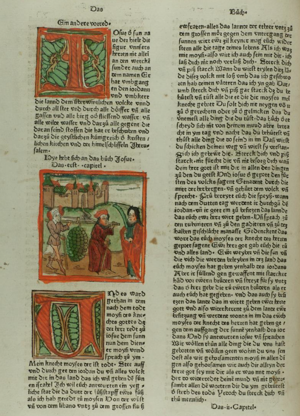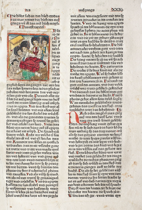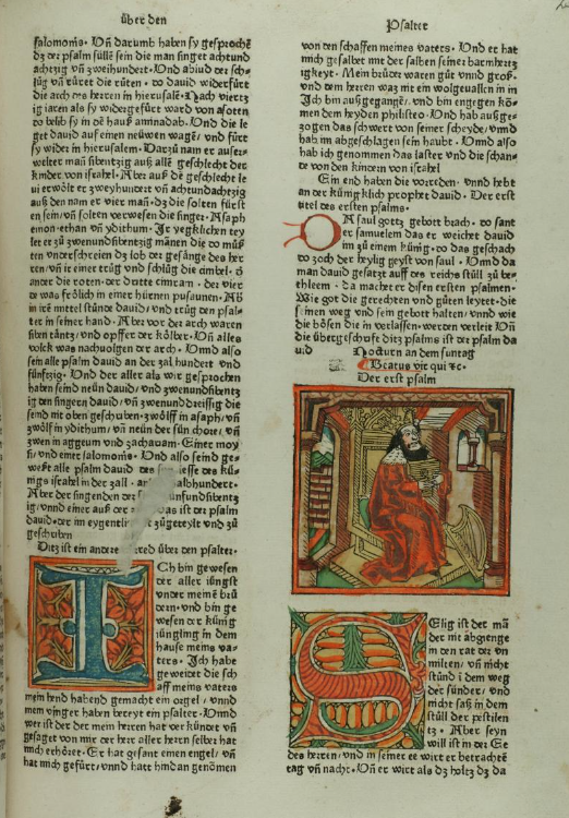 | 1477: Bíblia de l'impressor Anton Sorg (Sorg Bibel, Augsburg). Un tret característic d’aquesta Bíblia, la 7a Bíblia alemanya, és que l’impressor va decidir separar la inicial miniada de l’escena il·lustrada, de manera que la il·lustració ara es mostra independent de la lletra capital, tot ocupant l’amplària de tota una columna i apareixent subordinada en gran mesura al text. La primera de les dues Bíblies impreses per Sorg conté les xilografies ja emprades a la Bíblia de Pflanzmann de 1475. És de suposar que aquestes imatges no van ser fetes específicament per a edicions bíbliques, sinó per a altres obres espirituals avui desconegudes. Les esplèndides inicials i la xilografia van ser acolorides posteriorment. Sorg en va publicar una segona edició l'any 1480, que és considerada la 8a Bíblia alemanya. | ||