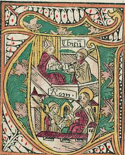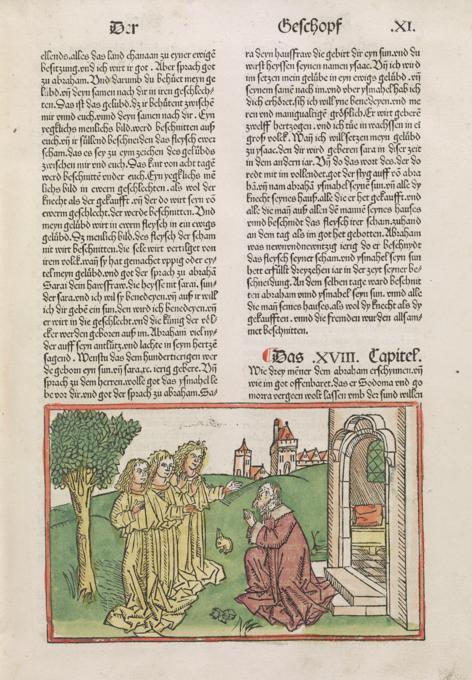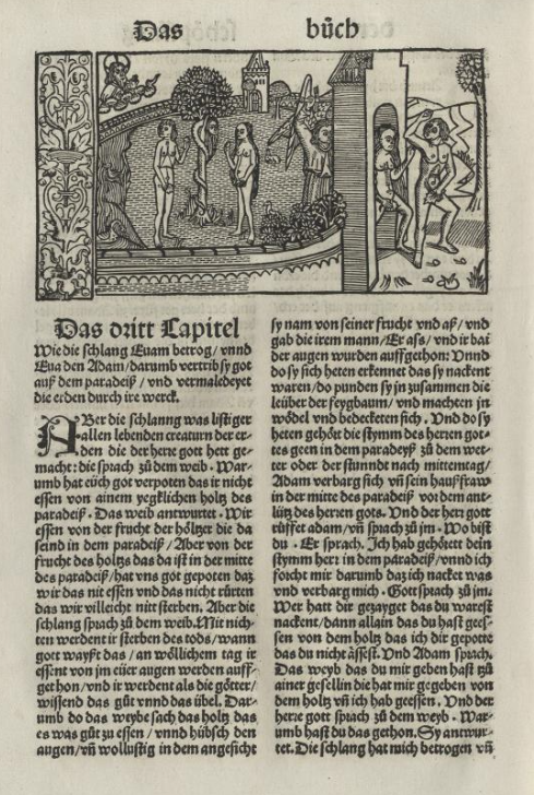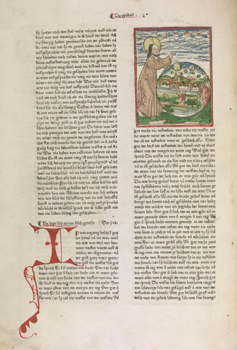 | 1483: Bíblia de l'impressor Anton Koberger (Koberger Bibel, Nuremberg). Obra en dos volums, és la 9a versió impresa de la Bíblia en llengua alemanya i potser la més bonica de totes elles. Se'n van produir 1.500 exemplars, dels quals uns 150 han arribat fins als nostres dies. Per a la rica decoració de la seva edició, Anton Koberger (ca. 1440–1513) va fer servir les xilografies, ara acolorides, que ja s'havien emprat a la Bíblia de Colònia (1478–79), fetes per Bartholomäeus von Unckel, les quals ell mateix havia ajudat a finançar. La primera d'aquestes xilografies, que precedeix el llibre del Gènesi, representa la creació d’Adam i Eva al Paradís i ocupa més de mitja pàgina (vegeu la imatge de més avall, a l'esquerra). A diferència de G. Zainer, el qual ja havia utilitzat inicials historiades xilogràfiques a la seva Bíblia de 1475–76, Koberger va permetre que les inicials pintades fossin subministrades per un rubricador o il·luminador. | |