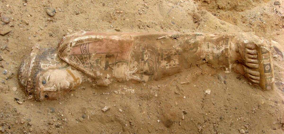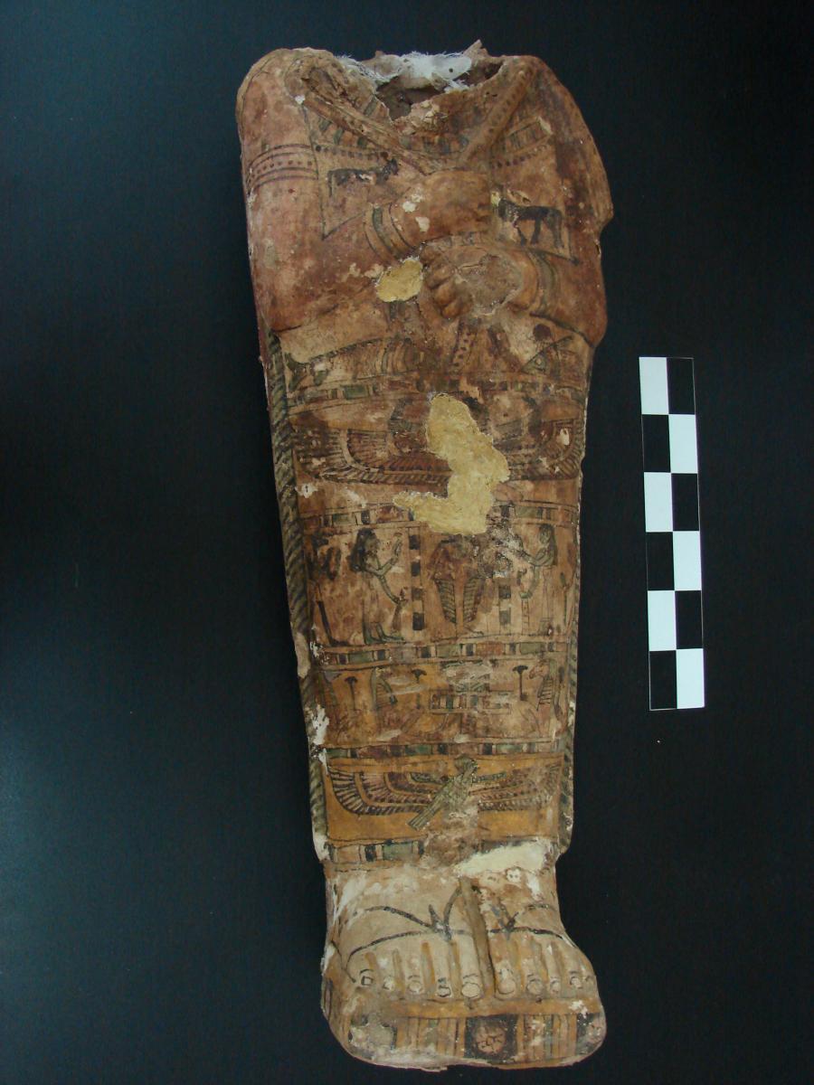 Mòmia d’època romana recoberta d’un cartonatge de guix decorat amb escenes de tradició faraònica. Els trets de la cara, el pentinat i les sandàlies són típicament romanes. Al costat del cap, uns recipients de l’aixovar funerari.