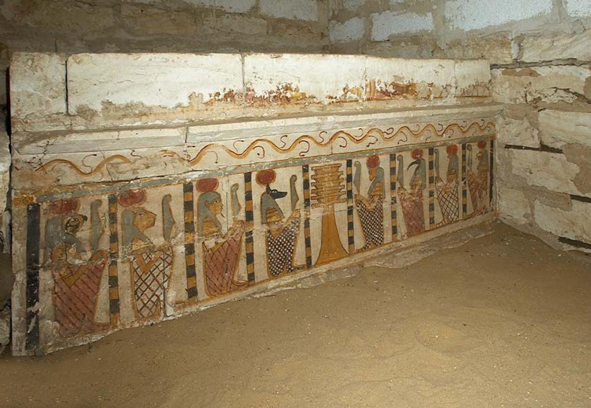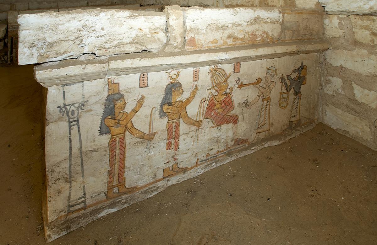 Decoració pictòrica d’un dels dos sarcòfags adossats a la paret d’aquesta tomba. El difunt, seguit d’Anubis, presenta libacions a un Osiris sedent, al costat d’Isis i Hathor.