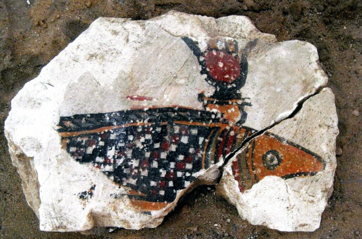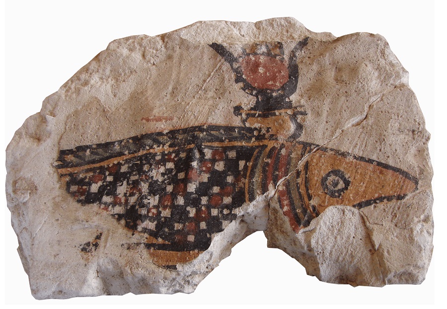 Fragment de decoració pictòrica amb la representació del peix oxirrinc. Observem que porta la corona hathòrica amb el disc solar entre les banyes de vaca. Aquestes corones són utilitzades per divinitats femenines.