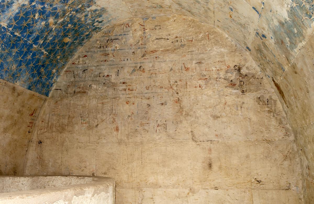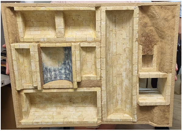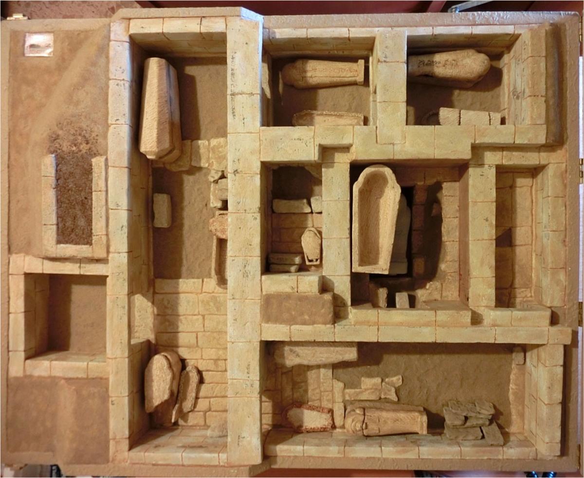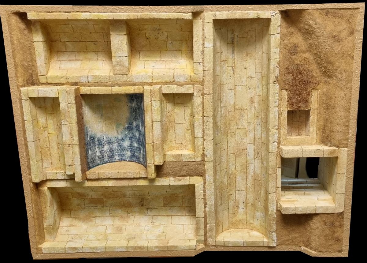 És obra de Manuel Hernández Yllán, dibuixant de la Missió Arqueològica d’Oxirrinc entre els anys 1992 i 1995. Va treballar, sobretot, en els calcs de les inscripcions i els dibuixos de la tomba saïta 1. Va donar la maqueta a la Societat Catalana d’Egiptologia, de la qual era soci.