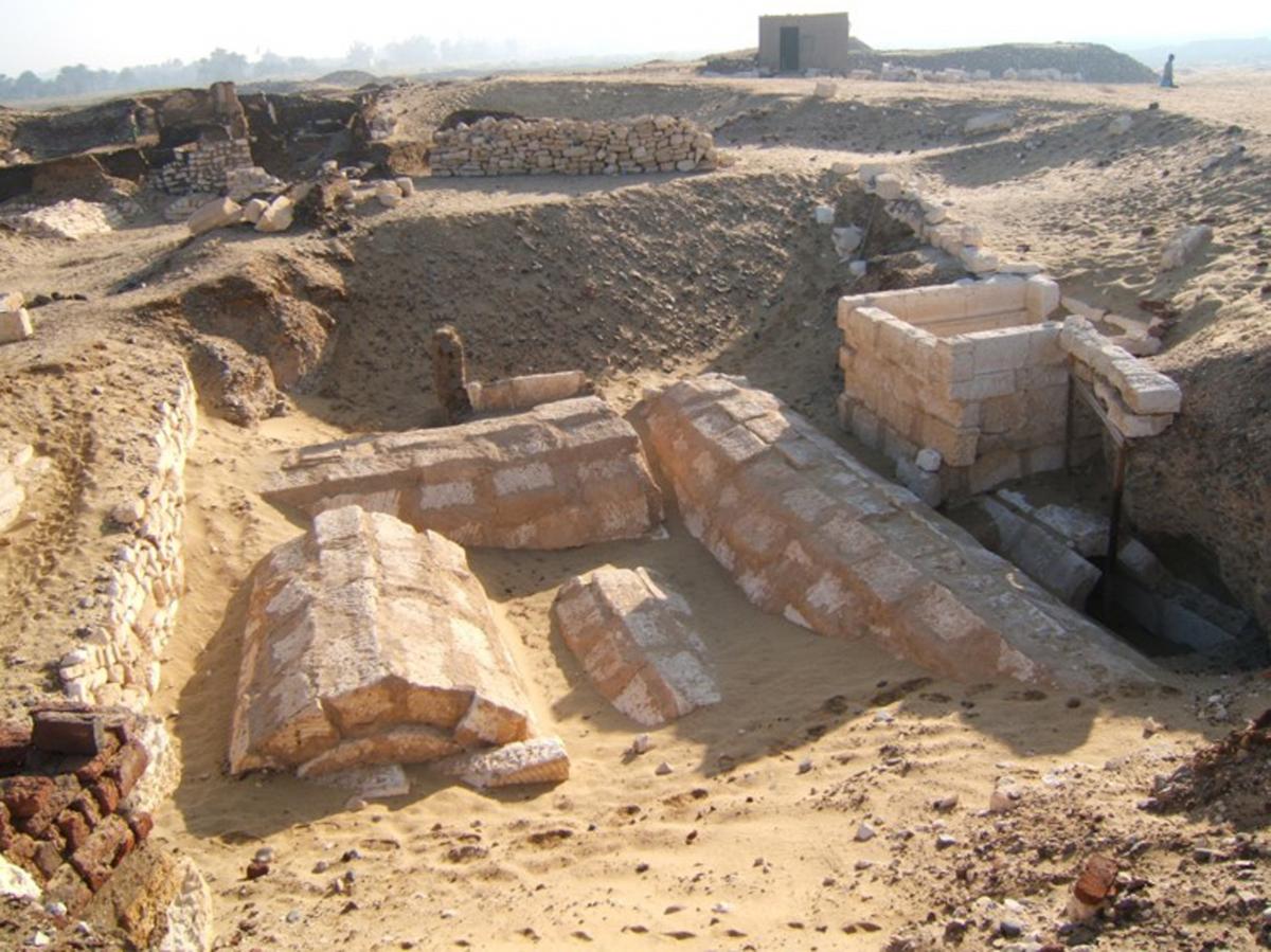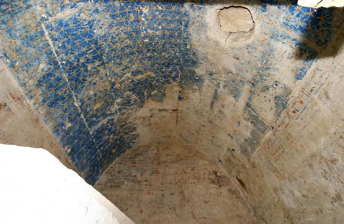 Part exterior de les voltes que cobreixen les diferents cambres de la tomba. A la dreta de la imatge es pot veure el pou quadrat de 4,20 metres de fondària que dona accés a l’interior del recinte subterrani.