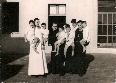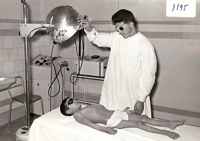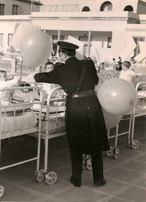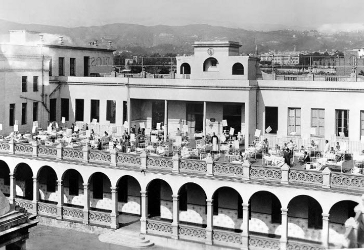 Nens a la terrassa de l'Hospital Sant Joan de Déu fent banys de sol |