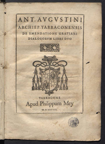 Agustí i Albanell, Antoni. Ant. Augustini ... De emendatione Gratiani dialogorum libri duo. Tarracone : apud Philippum Mey, 1587.  [8], 356, [10] pàgines; 4º (21 cm).