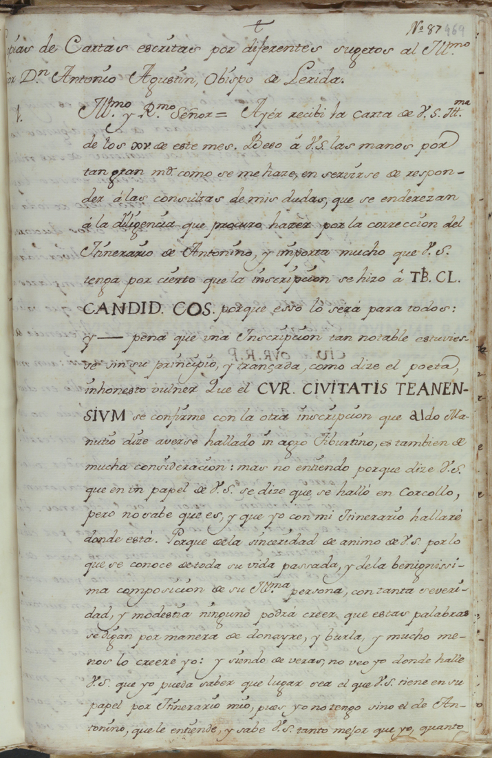 “Carta de Jerónimo Zurita a Antonio Agustín”. Dins: Miscel·lània de textos manuscrits i impresos del segle XVIII. Manuscrit sobre paper. Entre 1701 i 1800. [6], 522, [1] fulls; 310x210 mm.