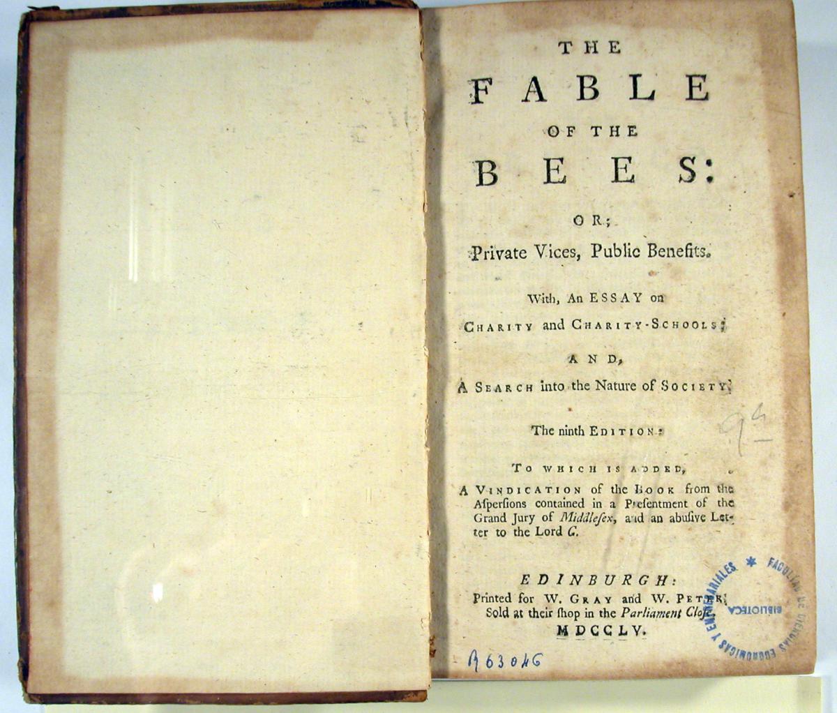 The Fable of the bees or Private vices, publick benefits ; with an Essay on charity and charity-schools ; and a Search into the nature of society ... ; to which is added a Vindication of the Book from de Aspersions contain'd in a presentment of the Grand-Jury of Middlesex and an abusive letter to Lord C.