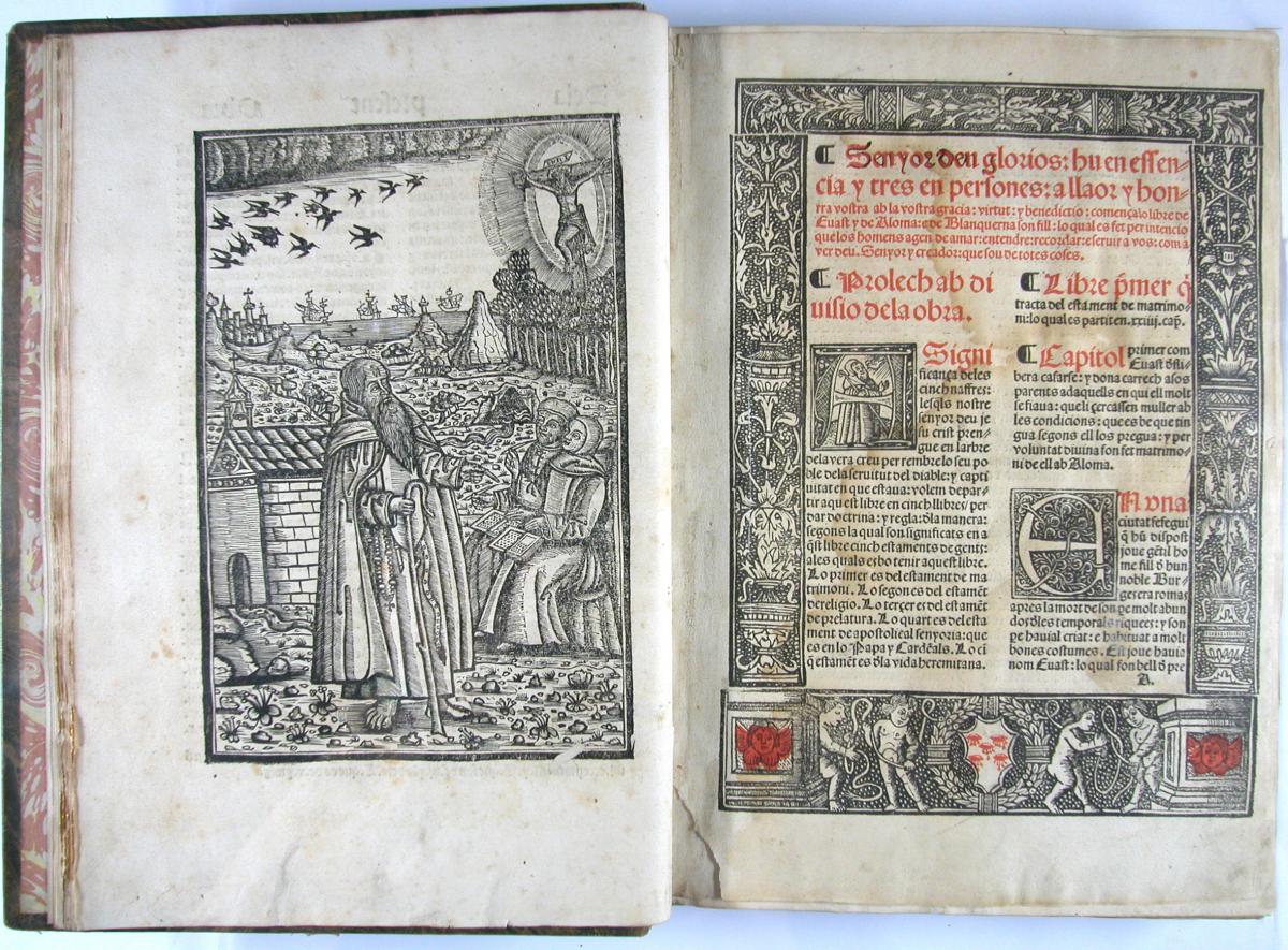 Primera edició sencera del Blanquerna (fins ara només s’havia imprès la seva 5ª part, Libre de Amic e Amat) i primera edició en català de gran qualitat tipogràfica. La portada amb frontispici barroc conté làmines gòtiques amb estranys ocells molt grans que es troben en altres edicions del mateix impressor.