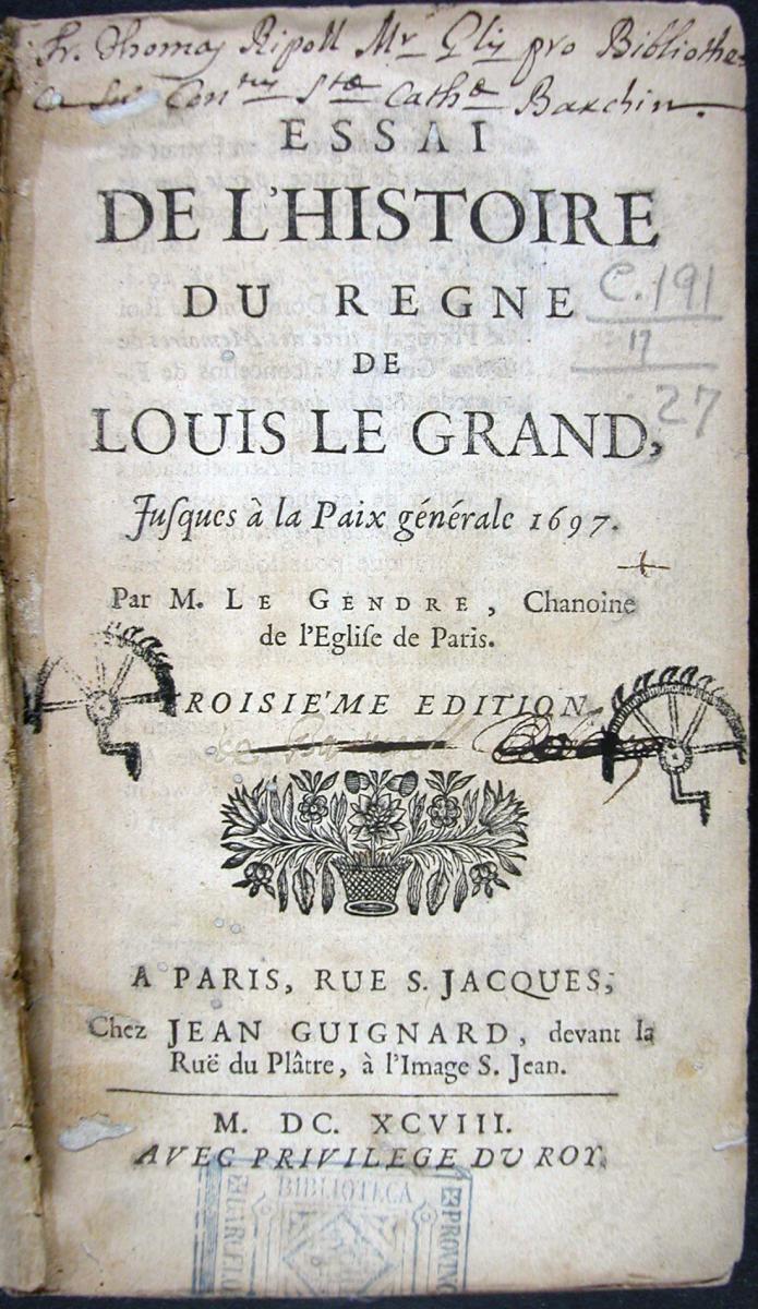 Le Gendre, Louis. Essai de l'histoire du règne de Louis le Grand, jusques à la paix générale, 1697. París: Jean Guignard, 1698.
