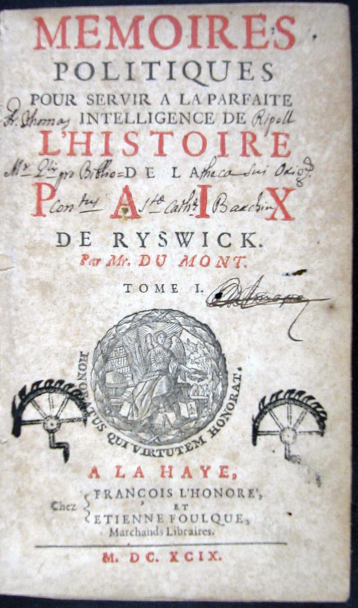 Dumont, Jean, baron de Carlscroon. Mémoires politiques pour servir a la parfaite intelligence de l'histoire de la paix de Ryswick. L’Haia: François L’Honoré i Étienne Foulque, 1699.