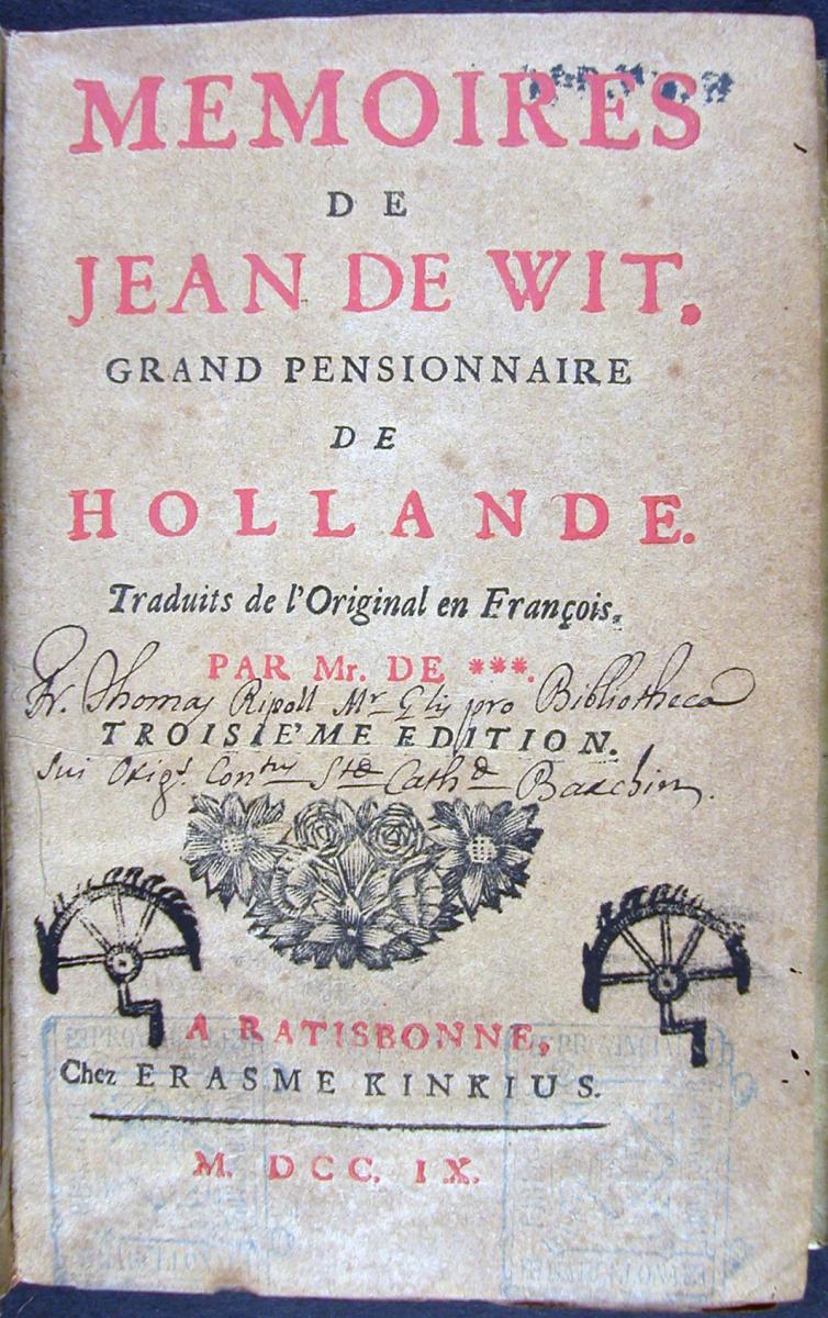 Court, Pieter de la. Mémoires de Jean de Wit, grand pensionnaire de HollandeRatisbona [i.e. L’Haia]: Erasmus Kinckius, 1709.