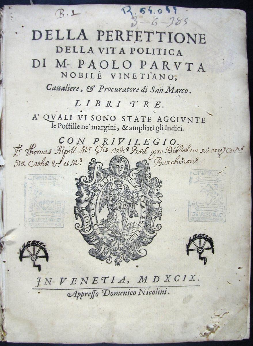 Paruta, Paolo. Della perfettione della vita politica. Venècia: Domenico Nicolini, 1599.