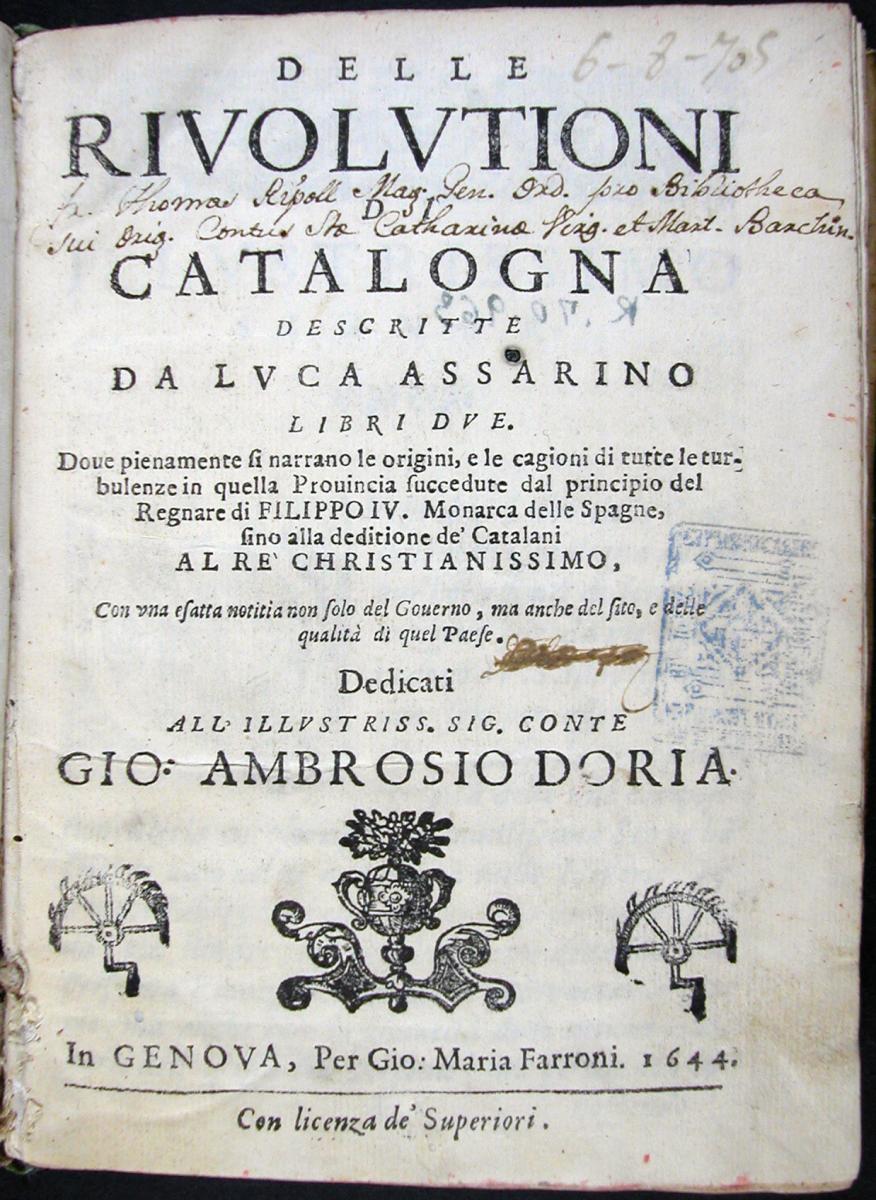 Assarino, Luca. Delle rivolutioni di Catalogna. Gènova: Maria Farroni, 1644.