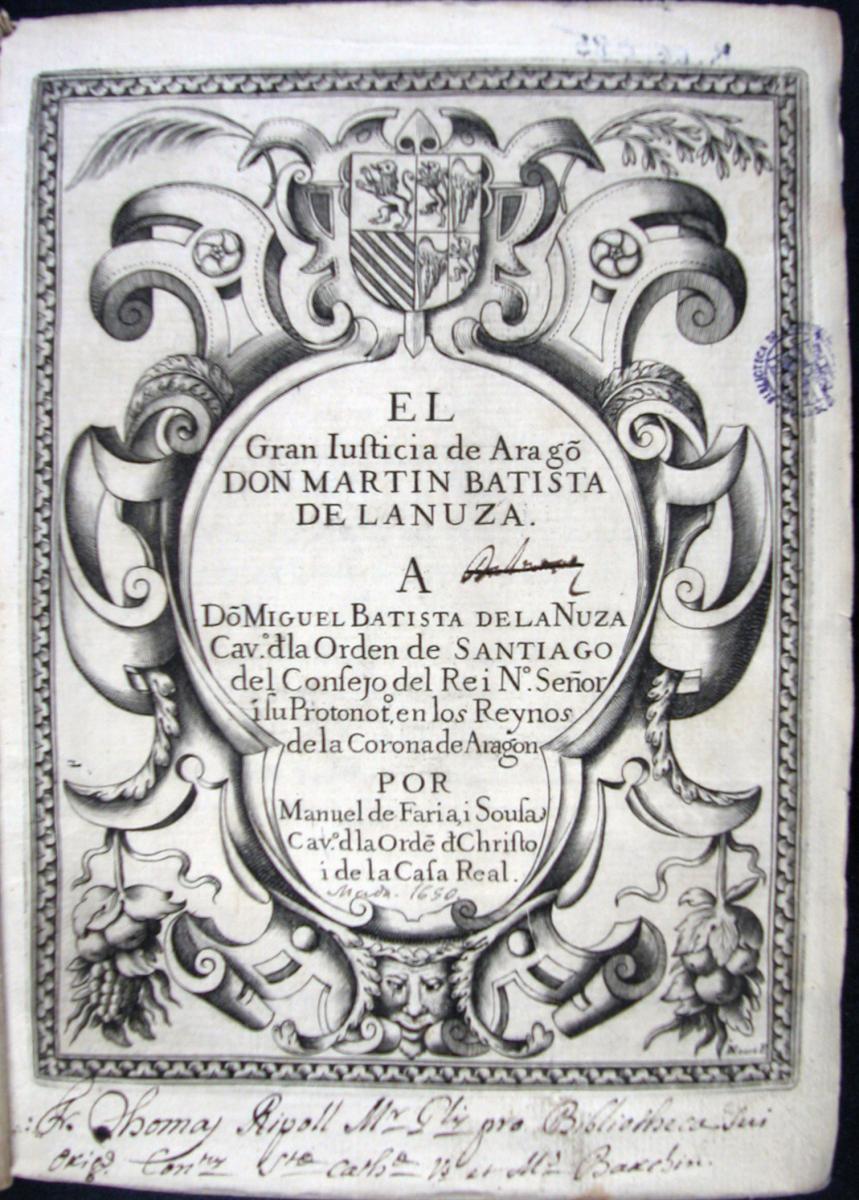 Faria e Sousa, Manuel de. El gran justicia de Aragón don Martín Batista de Lanuza. Madrid: Diego Díaz de la Carrera, 1650.