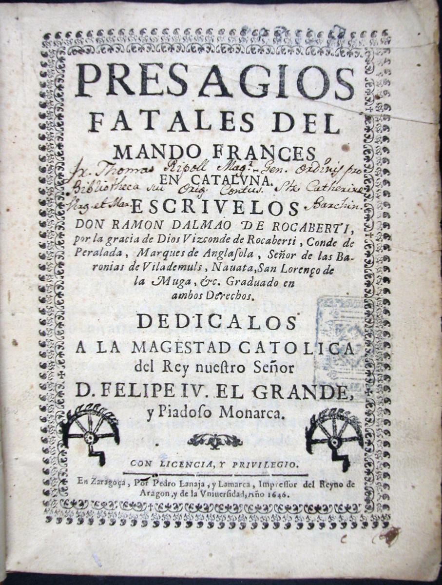 Rocabertí i de Safortesa, Ramon Dalmau de. Presagios fatales del mando francés en Cataluña. Saragossa: Pedro Lanaja y Lamarca, 1646.