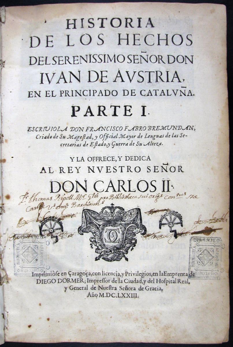 Fabro Bremundan, Francisco. Historia de los hechos del sereníssimo señor don Juan de Austria en el Principado de Cataluña, parte I. Saragossa: Diego Dormer, 1673.