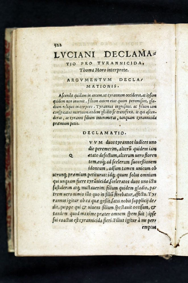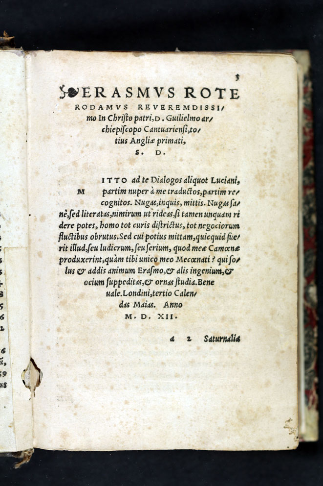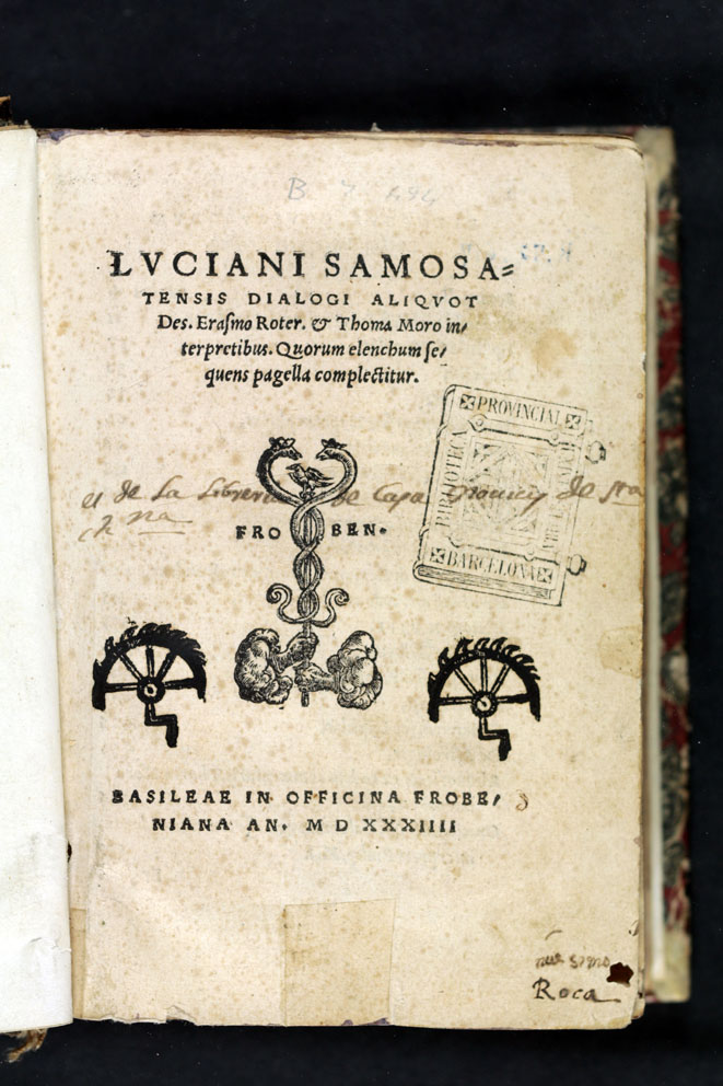 Títol: Luciani Samosatensis dialogi aliquot Des. Erasmo Roter. & Thoma Moro interpretibus, quorum elenchum sequens pagella complectitur.