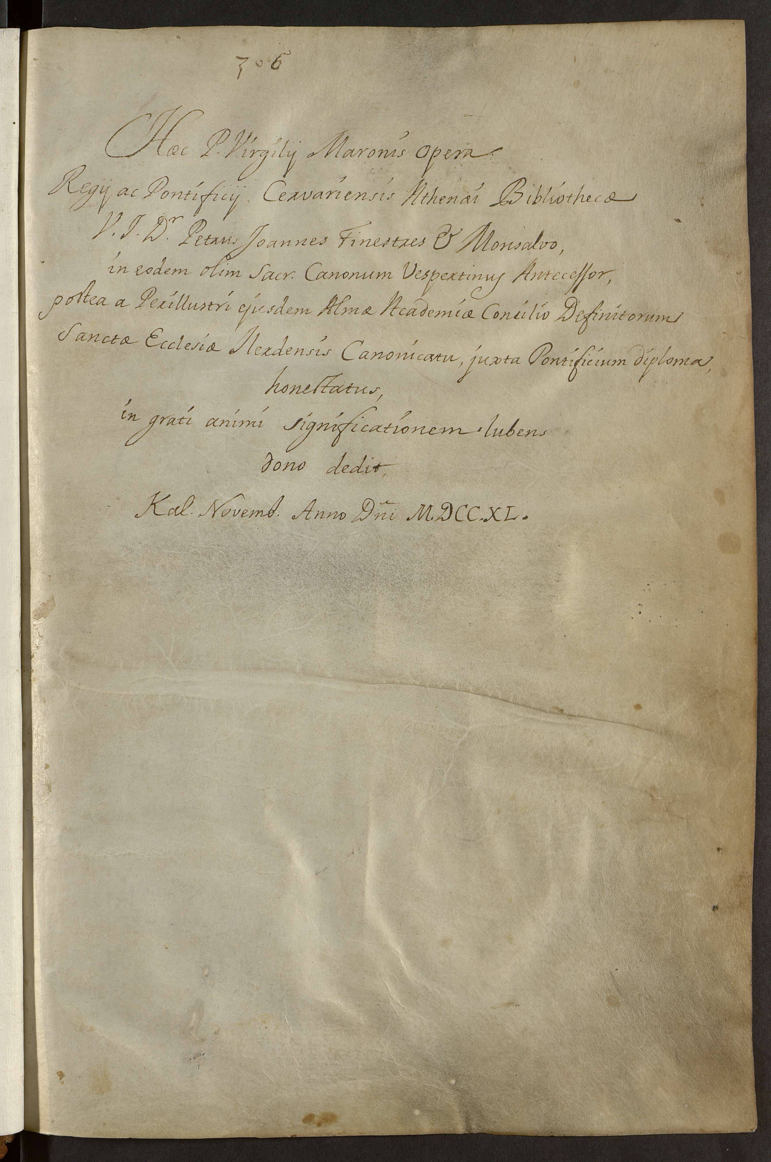 Antic possessor: Pere Joan Finestres i de Monsalvo (1690-1769) –professor de dret canònic a Cervera i canonge de Lleida– i Universitat de Cervera (del 1740 al 1846).