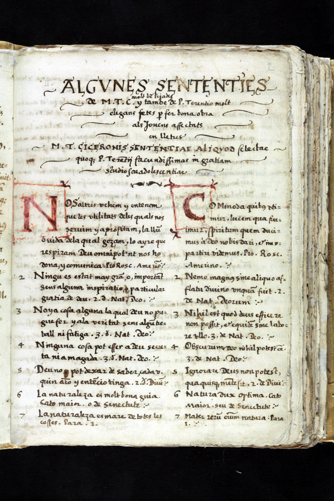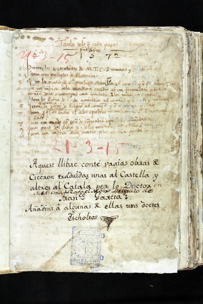 Contingut: “Aquest llibre conté varias obras de Cicerón traduidas unas al castellá y altres al catalá per lo doctor en medicina Rafael Moix, discipulo de Francisco Garcia, anyadint a algunas de ellas uns doctes escholios”.