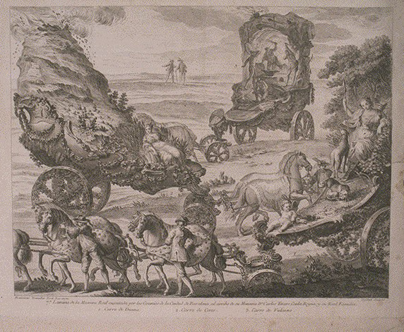 Dins: Máscara Real executada por los Colegios y Gremios de la ciudad de Barcelona para festejar el feliz desseado arribo de nuestros augustos soberanos Dn. Carlos Tercero y Dª Maria Luisa de Saxonia, con el Real Príncipe e Infantes. Barcelona : Tomas Piferrer, 1764.