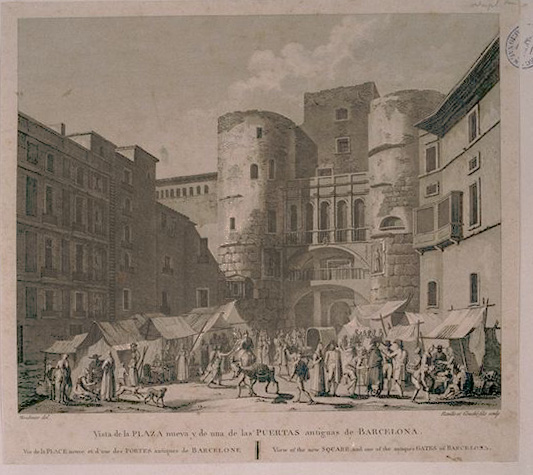 Vista de la Plaza nueva y de una de las puertas antiguas de Barcelona. Moulinier del. Reville et Couché fils sculp. Dins: Alexandre Laborde. Voyage pittoresque et historique de l'Espagne. París : de l'imprimerie de P. Didot l'ainé, 1806-1820.