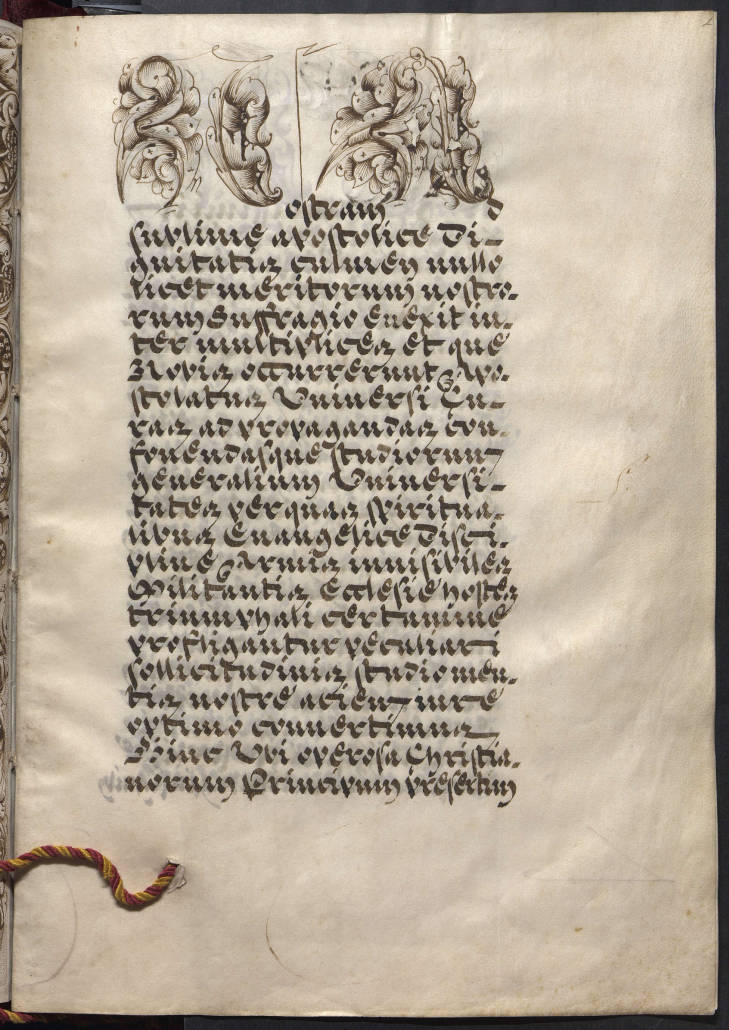 L’origen cancelleresc pontifici amb tota la seva pompositat, es revela en tots els elements del manuscrit: l’enquadernació en vellut carmesí amb cantoneres, fermalls, els escuts de Climent XII i d’Espanya de plata i el segell de plom propi de les butlles; l’escriptura bul·làtica o littera Sancti Petri d’una extrema estilització, per poder lluir un estil cal·ligràfic propi i per impedir possibles falsificacions; les grans inicials en forma de fullatge amb un poderós efecte decoratiu i de lectura especialment difícil.