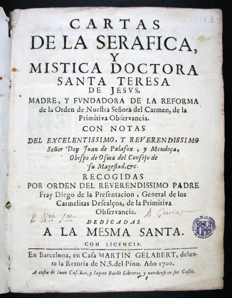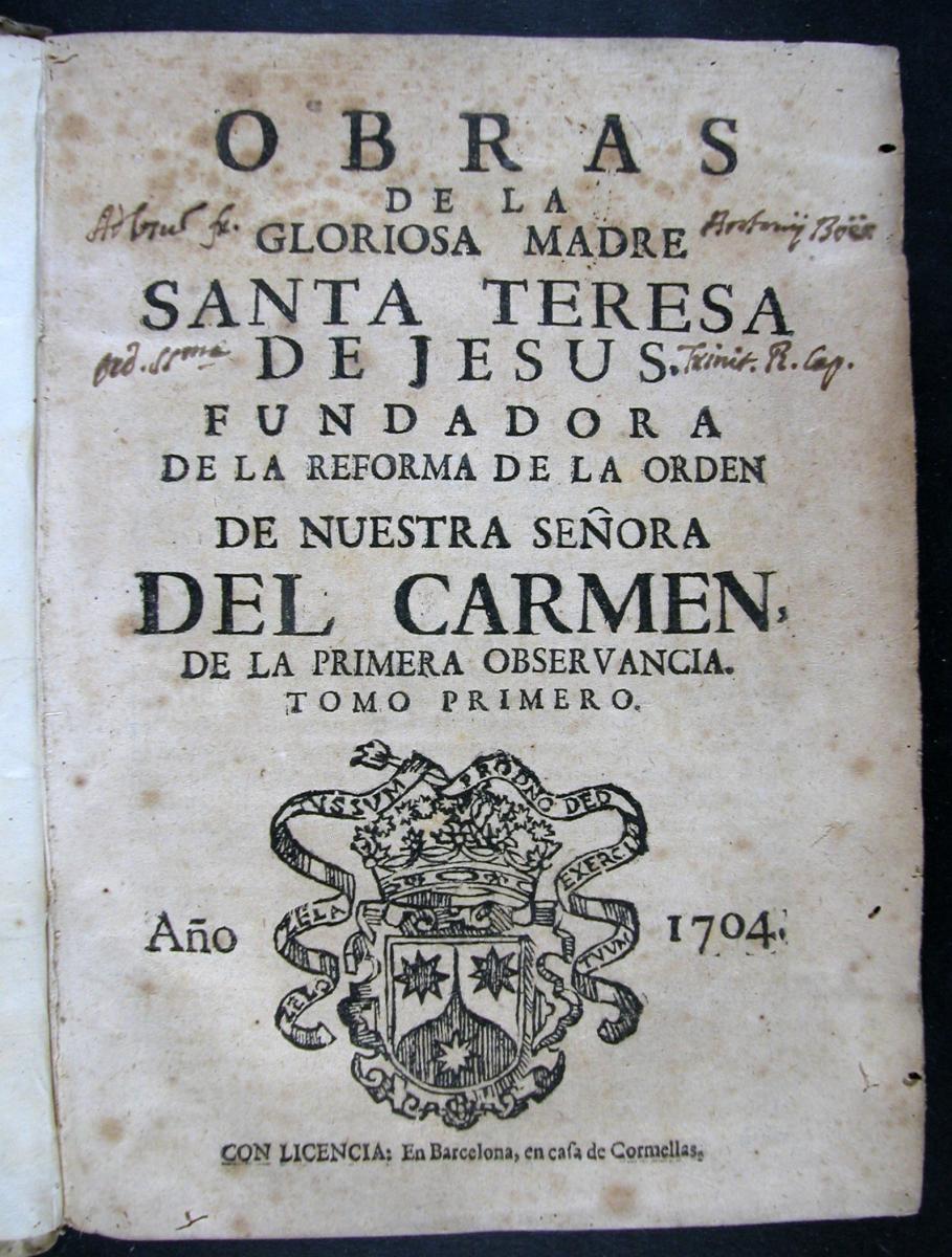Els escrits de Teresa de Jesús circularen, manuscrits, abans de la mort de la religiosa (1582). Les obres completes de Teresa de Jesús van publicar-se a Barcelona per primer cop en 1588, el mateix any que l’edició prínceps editada a Salamanca, tot i que s’havien publicat de forma fragmentària i retocada a Évora (1583) i després a València (1587). L’edició més universal en aquells moments, en llatí, publicada a Colònia (1610), es va fer a partir de la publicada a Barcelona.