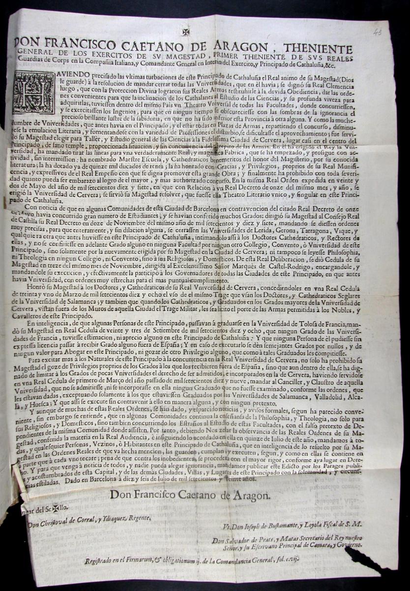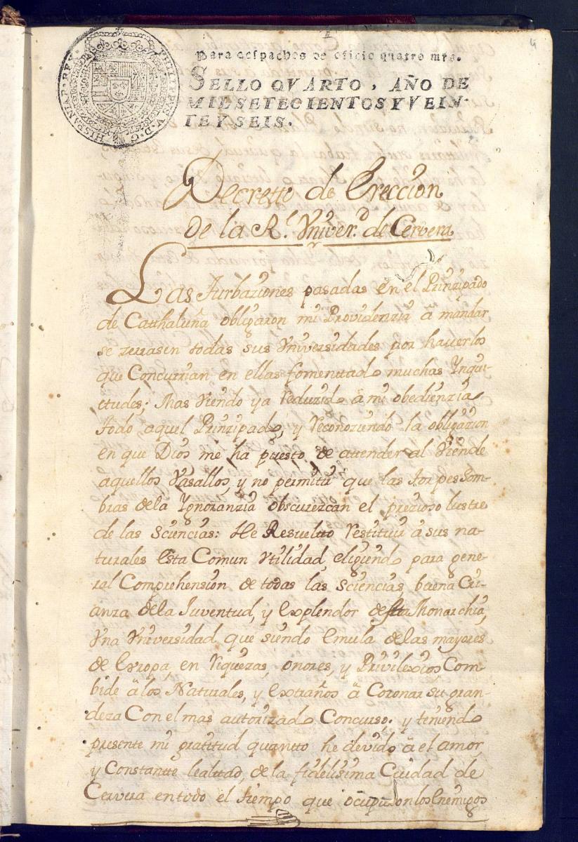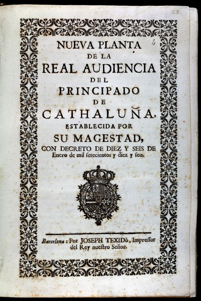 La derrota austriacista de 1714 i l’arribada de la nova dinastia borbònica comportà una reformulació des del punt de vista polític, econòmic, judicial i educatiu. El Decret de Nova Planta, el Cadastre de 1716, la supressió dels estudis universitaris a la ciutat de Barcelona i la fundació de la Universitat de Cervera el 1717, són els pilars fonamentals a partir dels quals s’instaurà i es desenvolupà el nou règim. Aquí us presentem unes quantes mostres del nou ordre que l’arribada dels borbons representà.