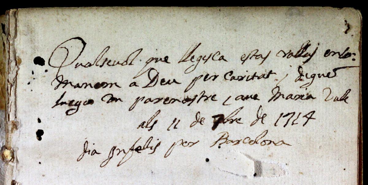 El Setge i la desfeta final eren ben presents en la consciència individual de les persones tal i com ho demostren els dos casos que hem seleccionat. El primer que presentem és una nota manuscrita, datada el mateix 11 de setembre de 1714, que podem trobar al full de guarda anterior d’una Gramàtica llatina d’Èlius Donat, publicada a Lió el 1549.