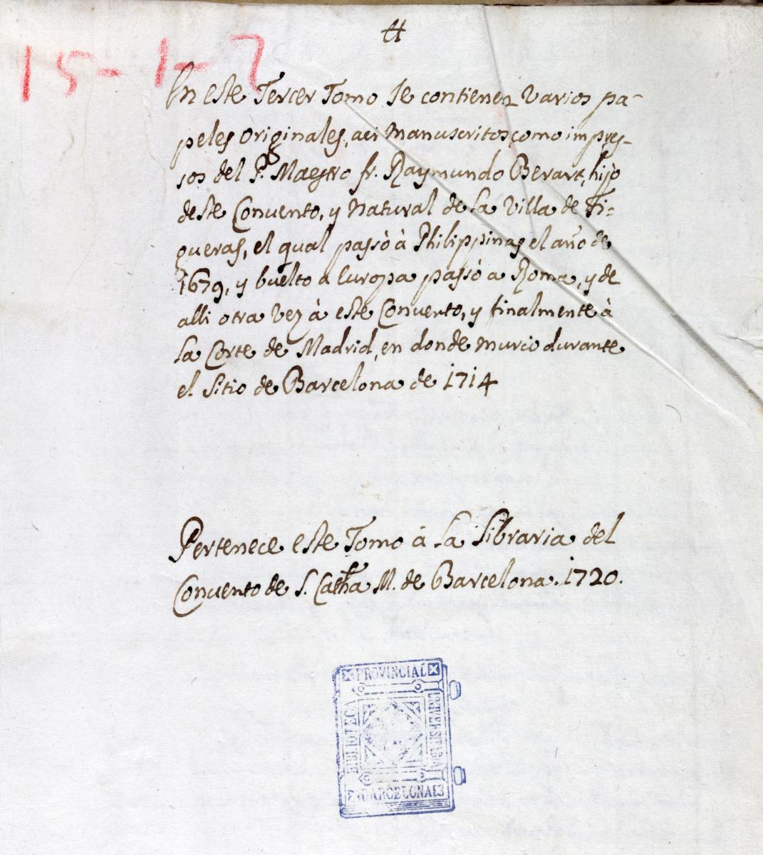 La segona imatge que presentem correspon a un ex-libris manuscrit del Convent de Santa Caterina, datat el 1720, localitzat al f. 1r del manuscrit 1014, on s’esmenta el Setge de Barcelona de 1714.