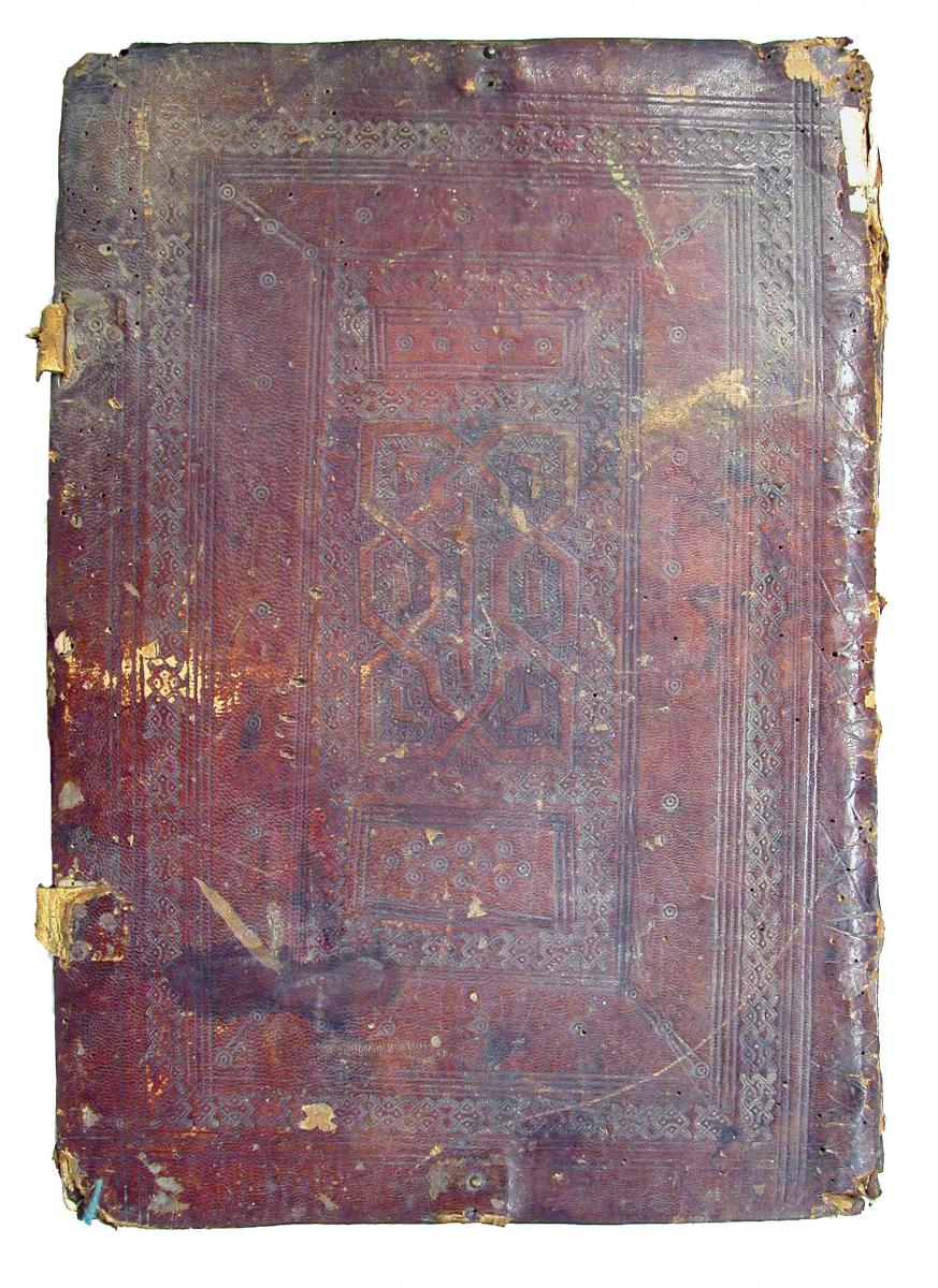 Enquadernació de pell de cabra sobre fusta d’estil mudèjar amb llaceries centrals. Restes de tanques metàl·liques. Finals del segle XV.