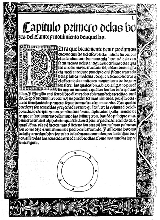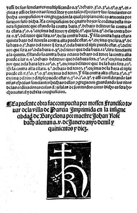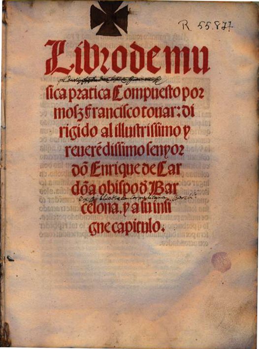 Libro de musica pratica compuesto por mos[en] Francisco Touar. Barcelona : por ... Johan Rose[m]bach ..., 1510 5 de janero. (B-58/2/6)