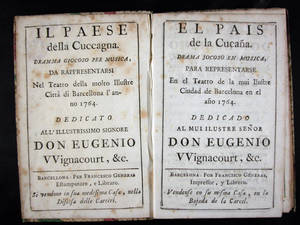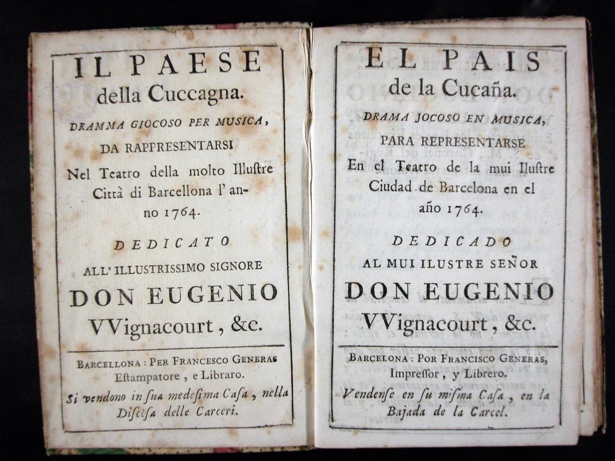 Goldoni, Carlo, 1707-1793. El Pais de la cucaña : drama jocoso en musica para representarse en el teatro de la ... ciudad de Barcelona en el año 1764 = Il Paese della cuccagna / [musica di Giacomo Rust]. Barcelona : por Francisco Generas ..., [1764?].