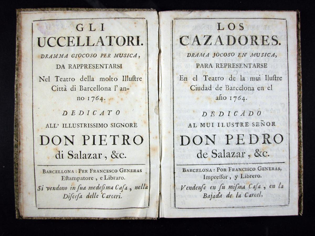 Goldoni, Carlo, 1707-1793. Los Cazadores : drama jocoso en musica para representarse en el teatro de la ... ciudad de Barcelona en el año 1764 = Gli Uccellatori : dramma giocoso per musica / [musica de Floriano Gazman]. Barcelona : por Francisco Generas ..., [1764?]