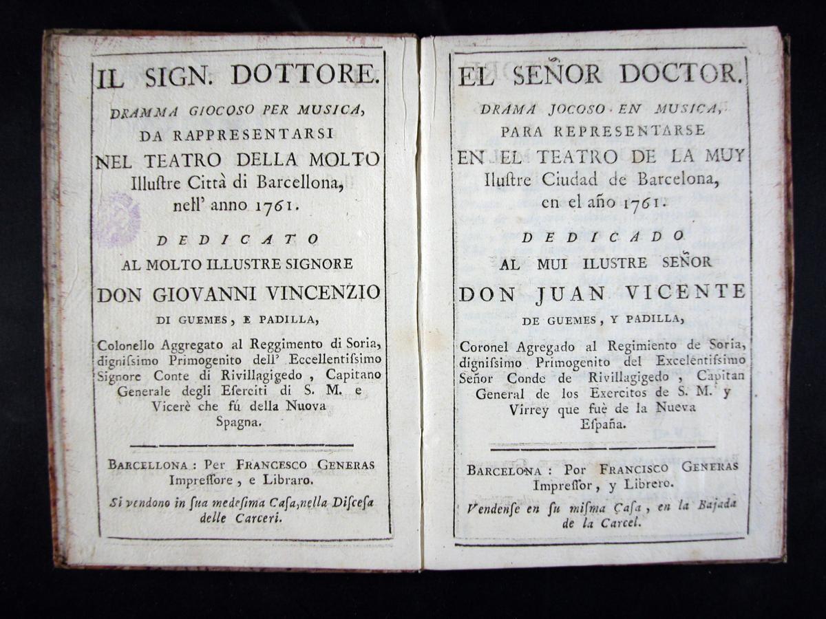 Goldoni, Carlo, 1707-1793. El Señor Doctor : drama jocoso en musica para representarse en el teatro de la ... ciudad de Barcelona en el año 1761 = Il Sign. Dottore : dramma giocoso per musica / [musica de Domingo Fischietti]. Barcelona : por Francisco Generas ..., [1761?]