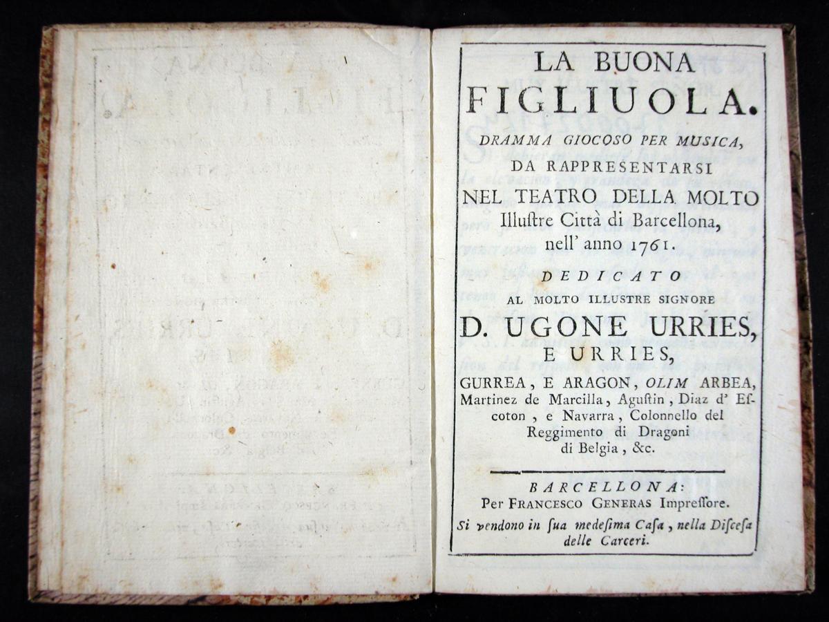 Goldoni, Carlo, 1707-1793. La Buona figliuola : dramma giocoso per musica da rappresentarsi nel teatro della ... città di Barcellona, nell'anno 1761 ... / [musica di Niccoló Piccini]. Barcellona : per Francesco Generas ..., [1761?].