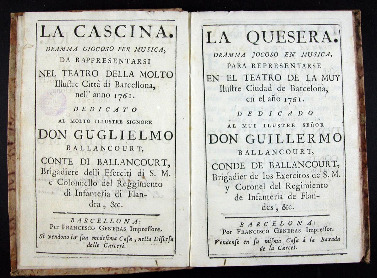 Goldoni, Carlo, 1707-1793. La Quesera : dramma jocoso en musica para representarse en el teatro de la ... ciudad de Barcelona, en el año 1761 ... = La Cascina / [musica de Giuseppe Scolari, Arias de Francesco Brusa]. Barcelona : por Francisco Generas ..., [1761?].