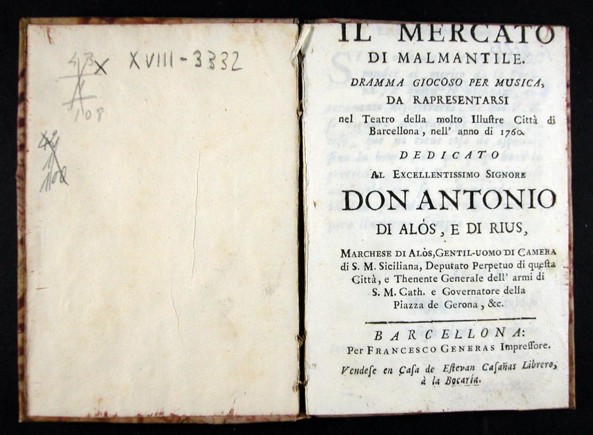 Goldoni, Carlo, 1707-1793. Il Mercato di Malmantile : dramma giocoso per musica da rapresentarsi nel teatro della ... città di Barcellona, nell'anno di 1760 ... / [musica di Domenico Fischetti]. Barcellona : per Francesco Generas ... : vendese en casa de Estevan Casañas ..., [1760?].